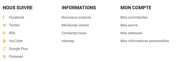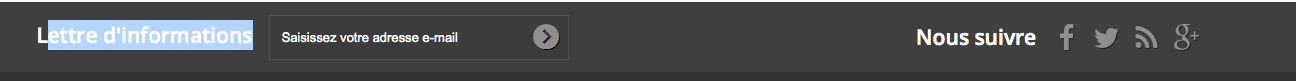 Bking Posted May 7, 2015 Author Share Posted May 7, 2015 (edited) Ce n'est pas celui qui fait un bloc de menu avec les réseaux sociaux... C'est celui qui est sur la même ligne "Lettre d'informations avec une case pour mettre le mail" et directement sur lamême ligne à droite il y a suivez nous et les logos des réseaux sociaux". Voir le fichier joint en image Le " Nous Suivre " En tout ca merci de m'aider... Edited May 7, 2015 by Bking (see edit history) Link to comment Share on other sites More sharing options...