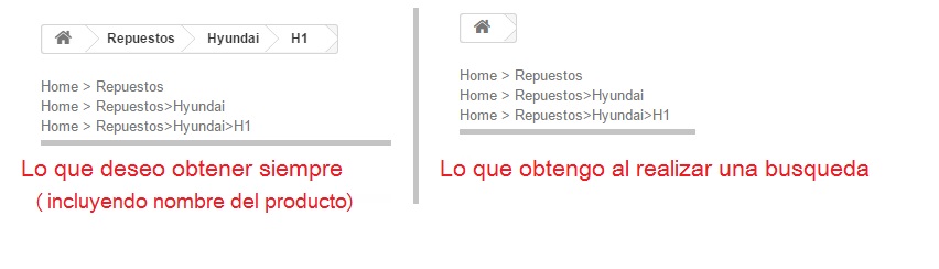 jfcordova Posted May 7, 2015 Share Posted May 7, 2015 (edited) Hola, Estoy intentando configurar el breadcrumb que tal forma que siempre muestre el path completo de todos los productos, (categorias y subcategorias) actualmente me muestra el path completo unicamente si voy entrando categoria por categoría hasta llegar al producto, pero si realizo una busqueda y entro directamente a una pagina de producto, le breadcrumb me muestra "home > nombre del producto" En la imagen adjunta muestro lo que deseo obtener. Tengo la siguiente configuración según un post anterior que encontré pero que no resuelve totalmente el asunto. ya que ya no me aparece el nombre del producto al final del breadcrumb. La configuración: Controlers/front/ProductControler.php protected function assignCategory() { // Assign category to the template if ($this->category !== false && Validate::isLoadedObject($this->category)) { $all_product_subs = Product::getProductCategoriesFull($this->product->id, $this->context->language->id); if(isset($all_product_subs) && count($all_product_subs)>0) { foreach($all_product_subs as $subcat) $all_product_subs_path[] = Tools::getPath($subcat['id_category'], '', true); } $this->context->smarty->assign(array( 'path' => Tools::getPath($this->category->id, '', true), //THIS CONTAINS ALL PRODUCT SUBCATEGORIES PATH 'all_product_subs'=>$all_product_subs_path, 'category' => $this->category, 'subCategories' => $this->category->getSubCategories($this->context->language->id, true), 'id_category_current' => (int)$this->category->id, 'id_category_parent' => (int)$this->category->id_parent, 'return_category_name' => Tools::safeOutput($this->category->name) )); } y Theme/Breadcrumb.tpl {/if} {if isset($all_product_subs)} {foreach from=$all_product_subs item=prod_subcategory} <br /> <a href="{$base_dir}" title="{l s='return to'} {l s='Home'}">{l s='Home'}</a> <span class="navigation-pipe">{$navigationPipe|escape:html:'UTF-8'}</span> {if !$prod_subcategory|strpos:'span'}<span class="navigation_page">{$prod_subcategory}</span> {else} {$prod_subcategory} {/if} {/foreach} {/if} Gracias comunidad!! Edit: Mi version de prestashop es 1.6.0.11 Edited May 7, 2015 by jfcordova (see edit history) Link to comment Share on other sites More sharing options...