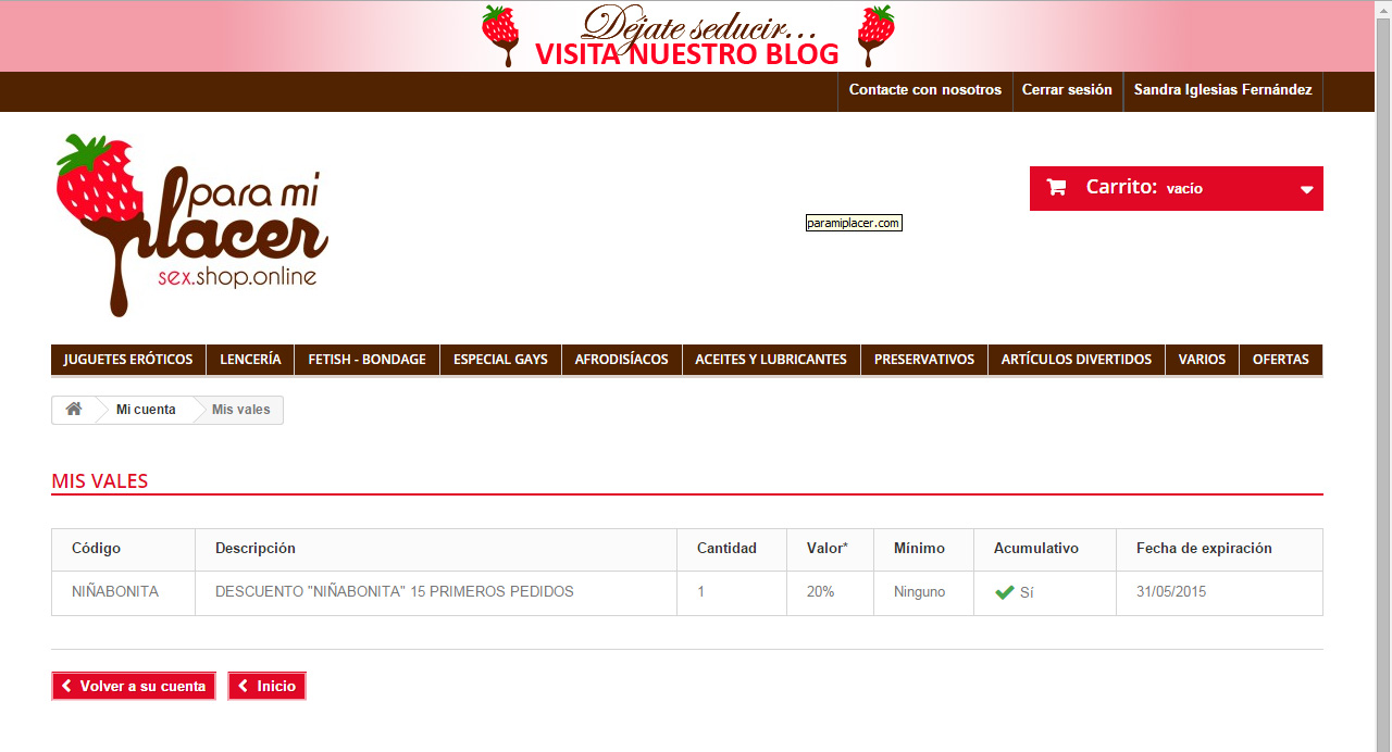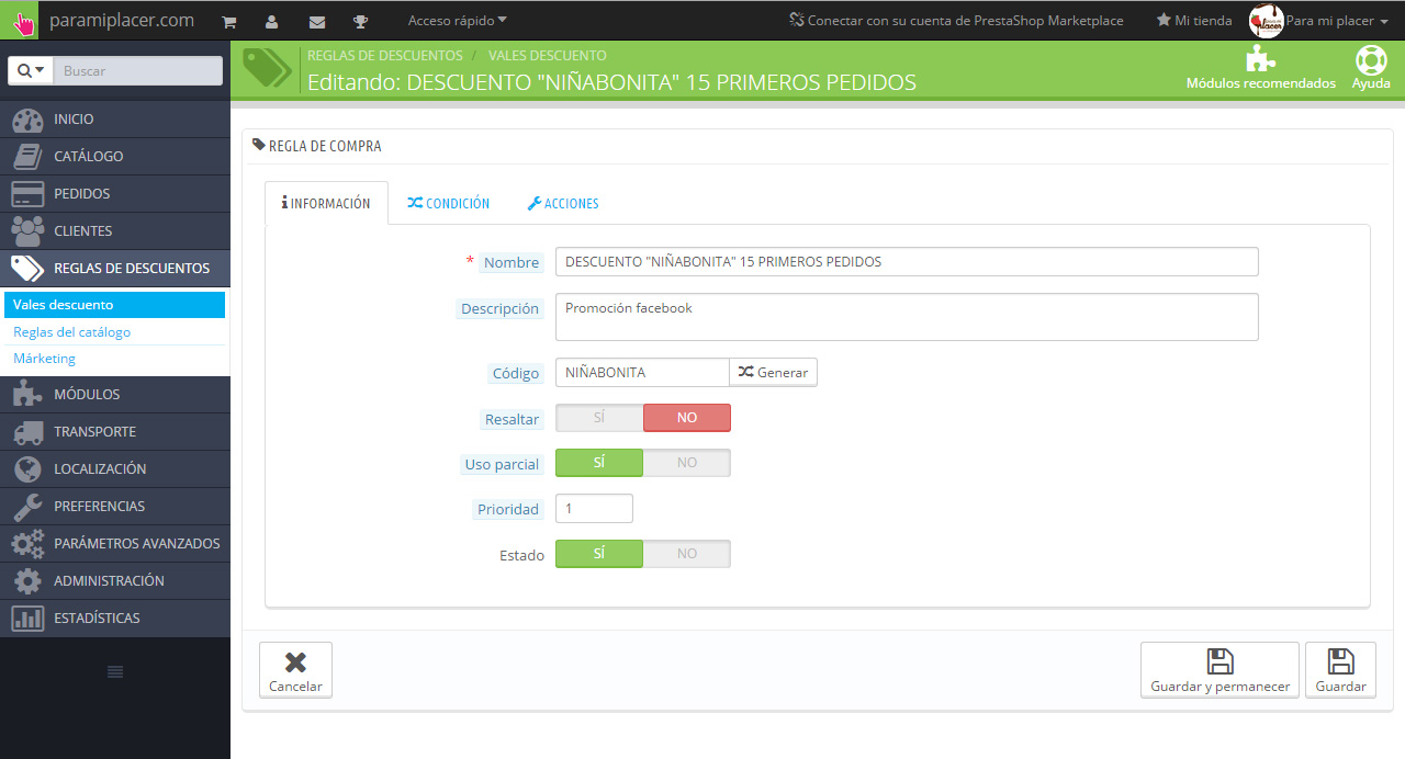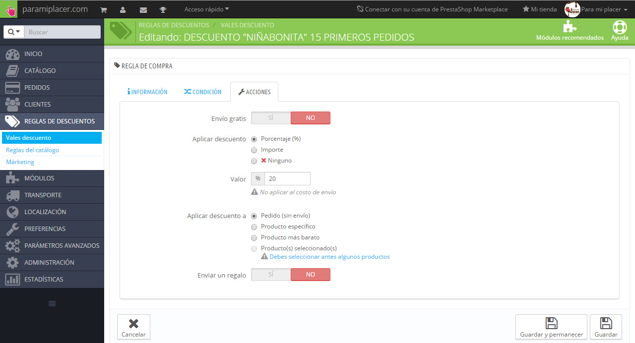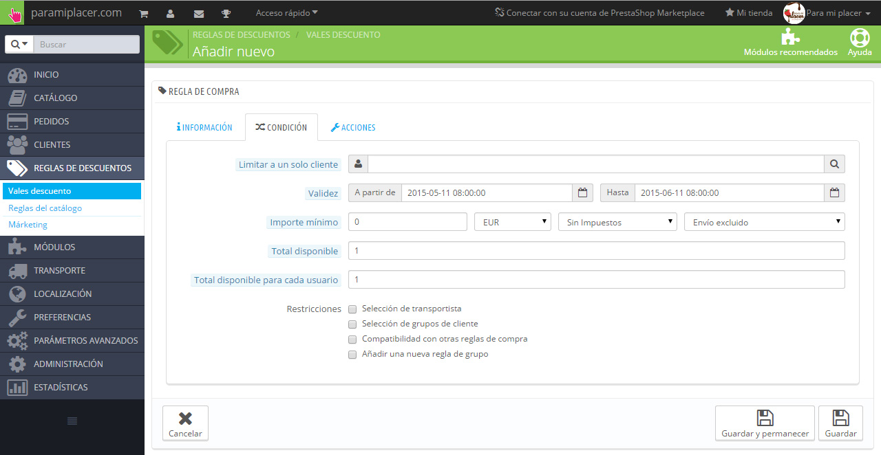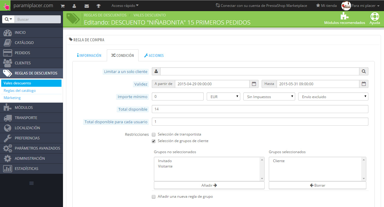 Para mi placer Posted May 8, 2015 Share Posted May 8, 2015 (edited) He subido un vale descuento a mi tienda y cuando he revisado los datos (como cliente registrado) me aparece el valor "acumulativo" marcado como "SÍ". He buscado en el área de administración cómo hacer que los vales no sean acumulativos pero no lo encuentro. Sin embargo buscando información por el foro parece ser que en versiones anteriores sí que existía algo así. ¿Dónde puedo marcarlo o desmarcarlo? Adjunto las capturas de las opciones que me salen en Reglas de descuento>Vales descuento: A ver si alguien más ducho puede ayudarme... Edited May 11, 2015 by Para mi placer (see edit history) Link to comment Share on other sites More sharing options...