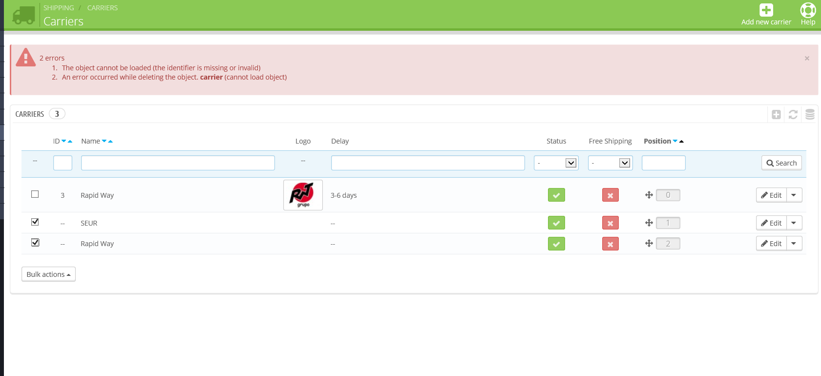 TriSmooth Posted May 11, 2015 Share Posted May 11, 2015 I want to remove 2 carriers in backoffice. One appears as "free shipping" in frontoffice (see pics). I've searched and tried so many possible solutions but nothing worked. I suppose it has something to do with a missing name or ID in the database. I'd very much appreciate if someone could help me. Many thanks in advance! Kind regards, Wilfred Link to comment Share on other sites More sharing options...