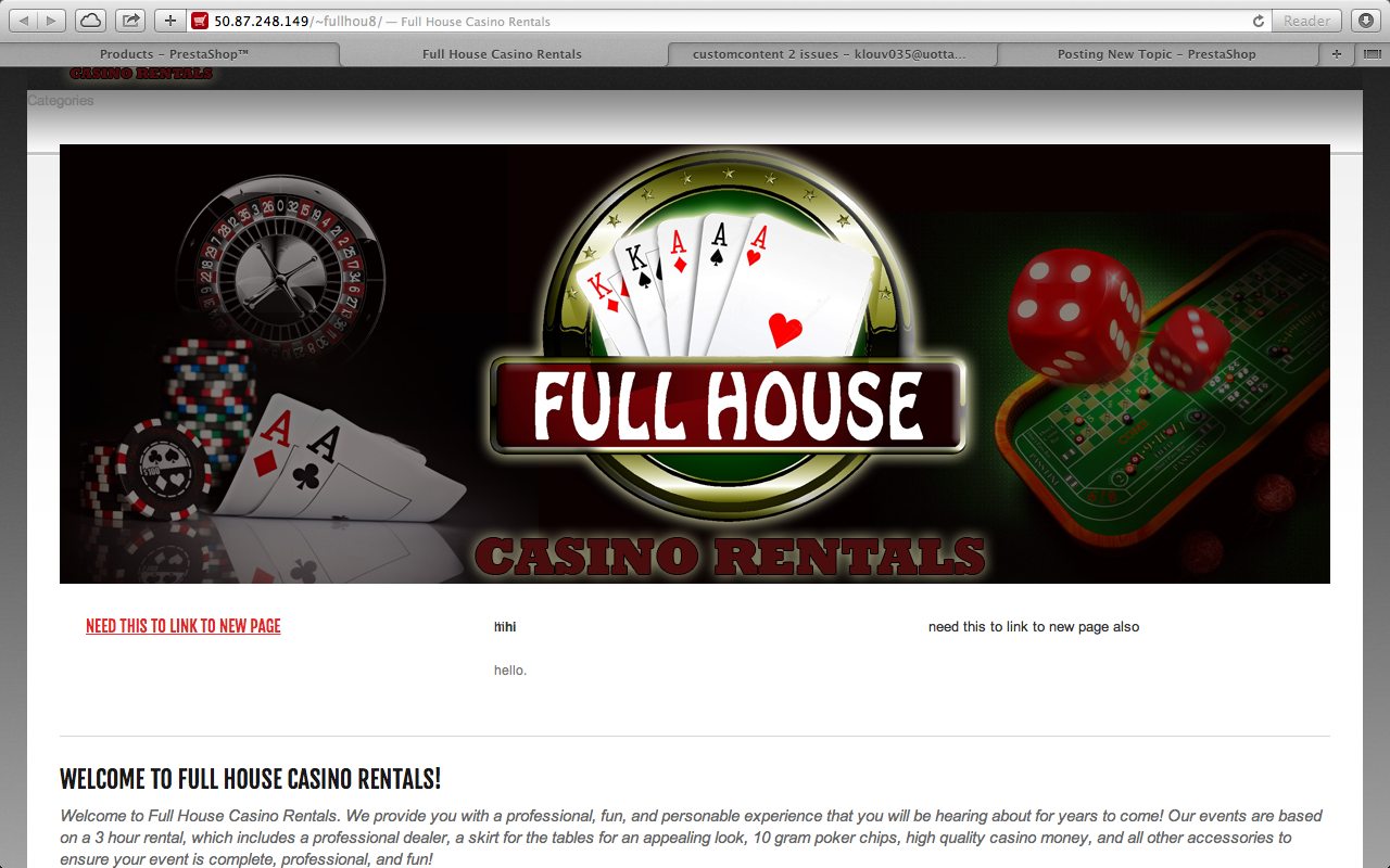 kory09 Posted May 11, 2015 Share Posted May 11, 2015 Hey everyone, I'd just like to say thanks in advance for any help! So far my website is good to go, but when I click on my (3) custom content2 links they just bring me to the home page (which the links are on)… I need these links to go to a new page, but don't know how! I think maybe I need the HTML code or something, but I really need these links to go to new pages. (the attached image is my website and shows the three links that need to go to a new page, i hope it helps). Also, in my product category, when i click on a product it brings me to a blank white page instead of bringing up the product. I need this fixed as well and have no clue how to do it. Lastly, how do I get a photo album up on my website using prestashop. Thank you! I am using version 1.5 because when I download 1.6 it rids all my website content. Thank you all sooooo much- this has been an ongoing issue for a month now! Link to comment Share on other sites More sharing options...