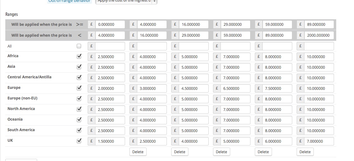 PascalVG Posted May 14, 2015 Share Posted May 14, 2015 Hi ShaoDow, Can yo describe exactly how you would like to have it in the end? I expect you don't need, (and don't want!) a warehouse, as it complicates things unnecessarily. So please describe how you want it to work, like: 0.00 -14.00 : 1,50 14.00 - 29.00: 3.50 29.00-xx.xx" XX.XX etc. If you have different prices for different countries (zones), also include in your description. In simplest form, you normally don't add any shipping to any product, and don't normally need use warehouses. Only when you HAVE 2 or more different warehouses where you ship from, you should use this. You jut add either price or weight ranges to a carrier, select the zones it can ship to, and add the prices for each range. pascal. Link to comment Share on other sites More sharing options...