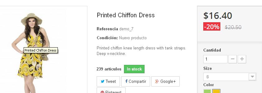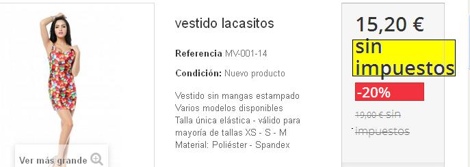 aixos Posted May 17, 2015 Share Posted May 17, 2015 (edited) Hola QUE FUNCIONE ASI : "Printed Chiffon Dress" Cuando miras el producto en la web de ejemplo de prestashop, no sale la palabra "sin impuestos" al ver el productos http://demo.prestashop.com/es/?view=front AHORA ME SALE ASI , VER CUADRO AMARILLO: "Vestido Lacasitos" Cuando miras el producto en la web sale la palabra "sin impuestos", esto quiero que no salga, ¿que tengo que desactivar? Seguro que es algo fácil porque en el ejemplo online de prestasshop sale bien. Saludos Edited May 17, 2015 by aixos (see edit history) Link to comment Share on other sites More sharing options...
