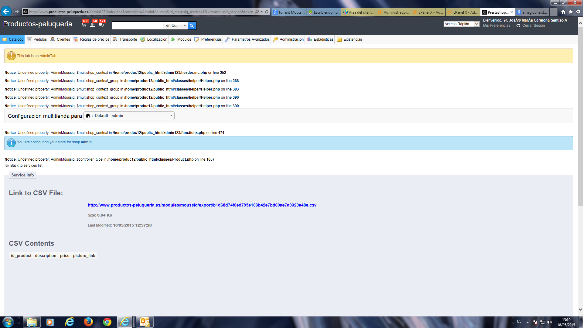 tudeporteysalud Posted May 18, 2015 Share Posted May 18, 2015 Hola, me dirijo a vds. a ver si me podeis echar una mano.... Estoy montando el modulo MOUSSIQ para exportar mis artculos, el problema es que en otra web que tengo funciona perfectamente, pero en esta no.... Después de crear la plantilla, creo que fichero y solo graba la ,cabecera sin artículos.. Active el modo de errores y sales los mensajes que pongo en la imagen , pero básicamente se refiera al problema de que la tienda es multitienda, con lo que no se si es algún problema o el modulo no va con la multitienda...... Os pido ayuda para este problema ,pues tengo parado esperando solventar esto...... Muchas gracias de antemano... Link to comment Share on other sites More sharing options...