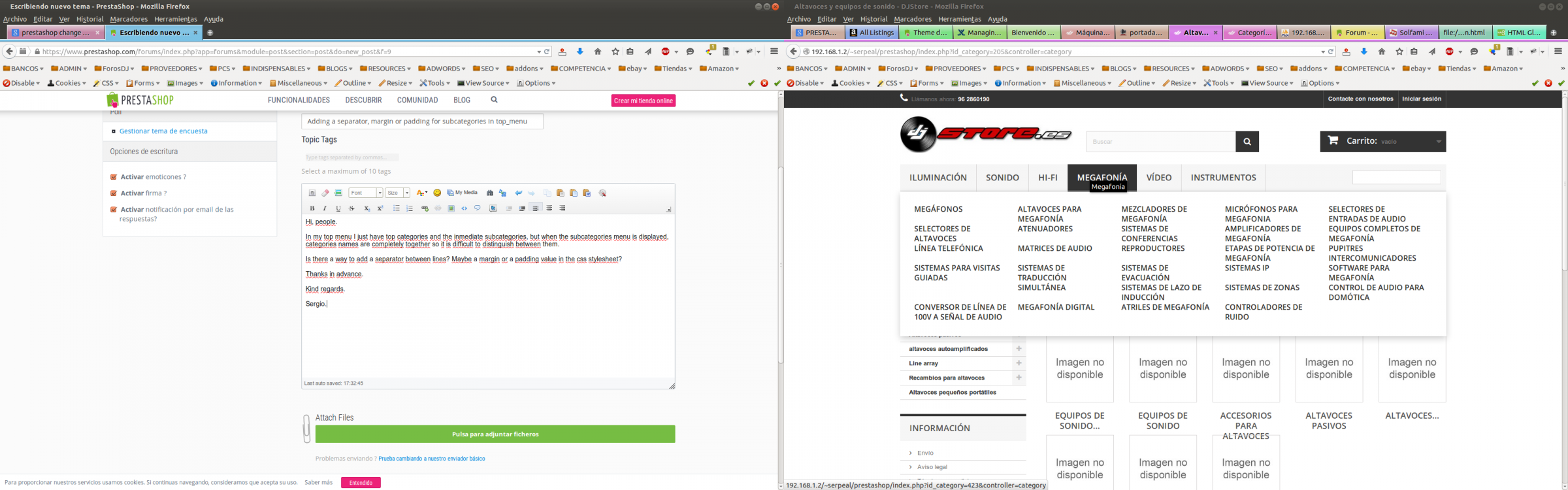 serpeal79 Posted May 18, 2015 Share Posted May 18, 2015 Hi, people. In my top menu I just have top categories and the inmediate subcategories, but when the subcategories menu is displayed, categories names are completely together so it is difficult to distinguish between them (photo attached). Is there a way to add a separator between lines? Maybe a margin or a padding value in the css stylesheet? Thanks in advance. Kind regards. Sergio. Link to comment Share on other sites More sharing options...
