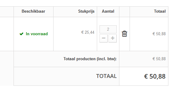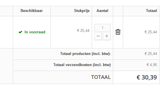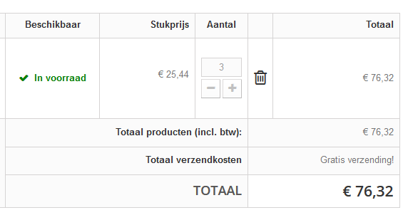 twc02 Posted May 21, 2015 Share Posted May 21, 2015 Hallo, Ik gebruik 1.6.011. Met multistore optie. Maak gebruik van default thema. De verzendkosten zijn gratis als het bedrag 50 euro of meer is. Dit gaat prima. Echter niet wanneer ik in het winkelwagenoverzicht zit en daar de aantallen aanpas. Dus standaard gaat het goed. Heb ik 3 producten in mijn winkelwagen en het bedrag is meer dan 50 euro staat er netjes "gratis verzending". Is het bedrag lager dan staat het bedrag van de verzendkosten er. Wanneer ik met de plus of min icoontjes het aantal aanpas, dan verdwijnt deze regel met verzendkosten. Als ik op f5 druk, staat de regel er weer. Heeft iemand enig idee hoe ik dit moet oplossen? Zie bijlage 1) een product besteld 2) via aantal opgehoogd naar 2, regel verdwenen 3) via aantal nog een opgehoogd naar 3, f5 en regel weer terug Link to comment Share on other sites More sharing options...