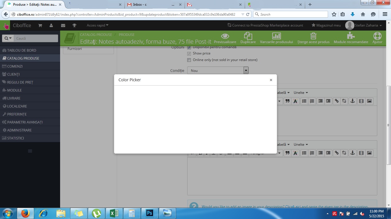 Stfan99 Posted May 22, 2015 Author Share Posted May 22, 2015 Multumesc pentru raspuns. Partea cu steguletul "nou" si-a revenit de la sine. Am pus produsele aseara si dimineata au disparut iar acum merge in parametri normali. Insa persista problema pentru casetuta de schimbare culoare de la descrierea produsului. Pun mai jos un print screen din admin si adresa site-ului: www.ciboffice.ro Link to comment Share on other sites More sharing options...