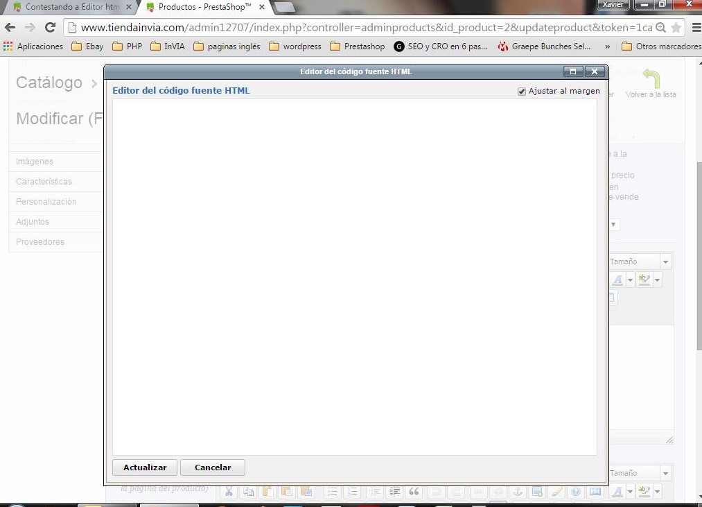 invia1912 Posted May 22, 2015 Author Share Posted May 22, 2015 (edited) Gracias por la respuesta. Dejo este pantallazo con el editor completamente en blanco, cuando debería de mostrar la descripción del producto en html Edited May 25, 2015 by invia1912 (see edit history) Link to comment Share on other sites More sharing options...
