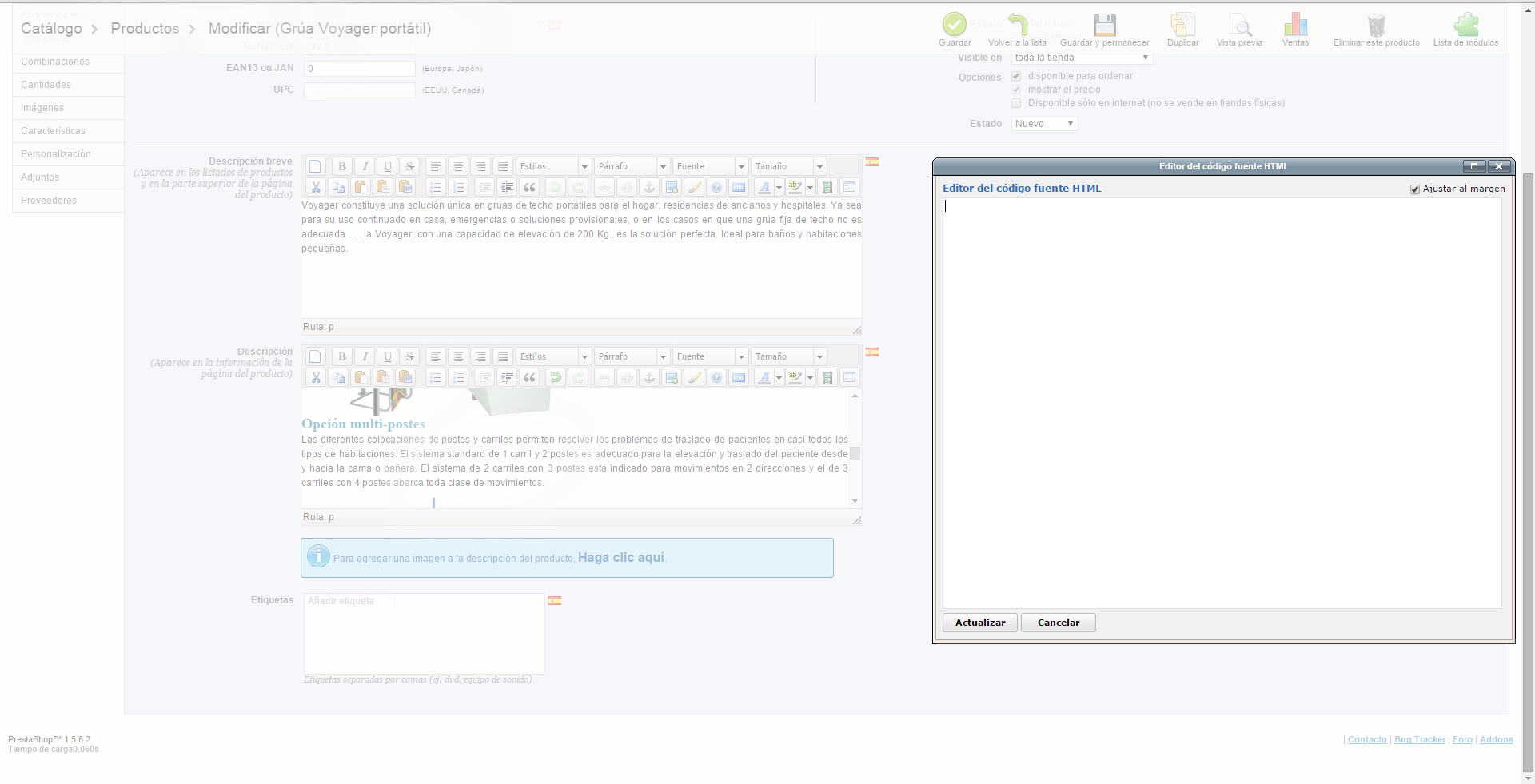 ortopediamimas Posted May 22, 2015 Share Posted May 22, 2015 Hola Mi problema es el siguiente, tengo la versión de prestashop 1.5 y de repente ya no me aparece el código html en la ficha del producto en el panel de control adjunto una imagen, el contenido esta lo que no puedo ver el es código a alguien le a pasado algo así gracias Link to comment Share on other sites More sharing options...