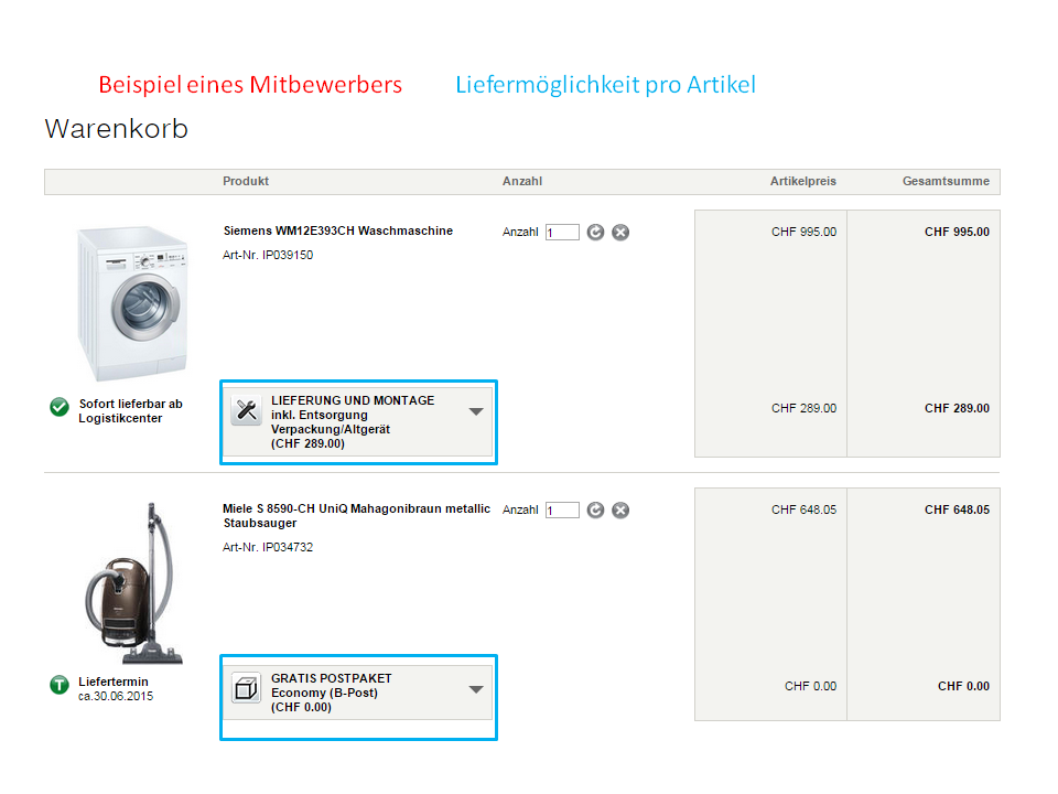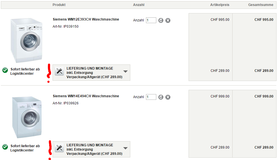 Maega2 Posted May 25, 2015 Author Share Posted May 25, 2015 Hallo carpe diem. Ich habe bereits mehrere Varianten angelegt. Mein Wunsch wäre es, dass der Kunde bei der Bestellung von zwei Haushaltgeräten auch die Liefer & Montagegebühr pro Gerät bezahlt. Als Beispiel ein ScreenShopt eines Mitbewerbers. SG Maega2 Link to comment Share on other sites More sharing options...