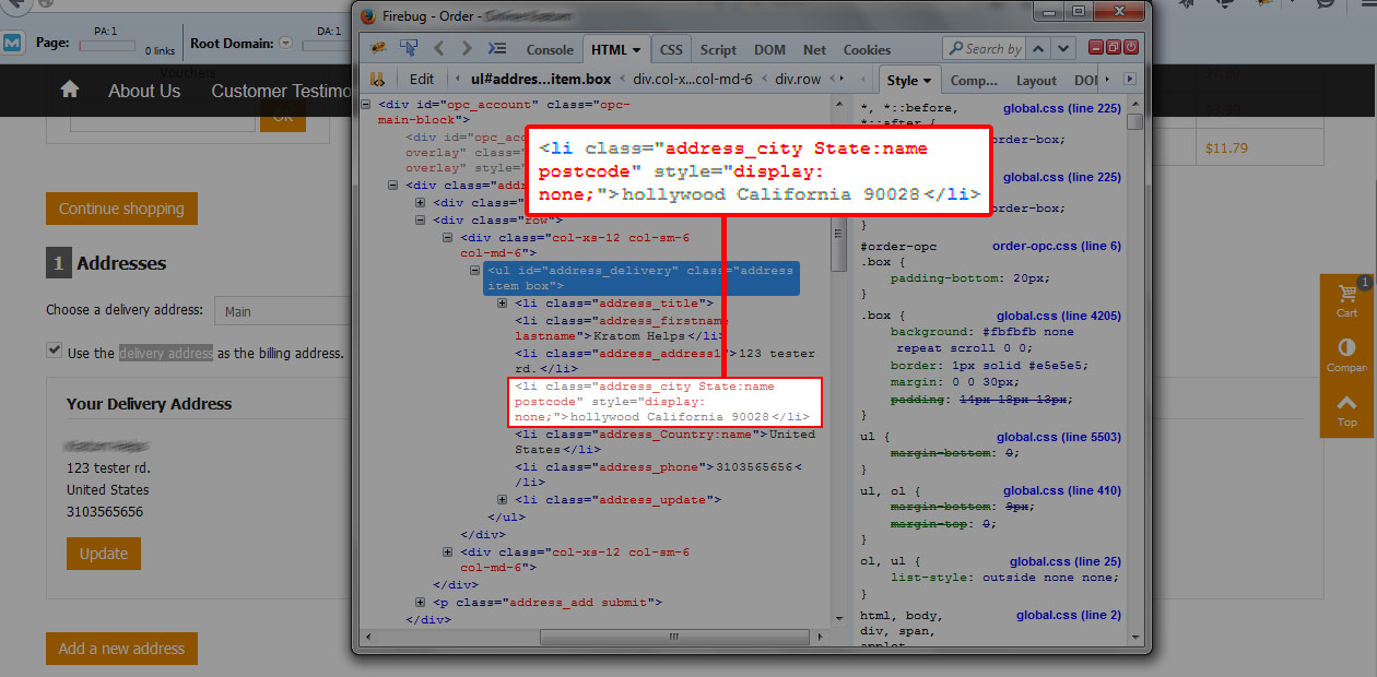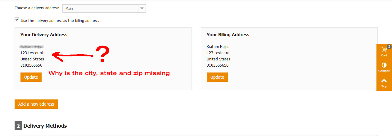 nakecorp2 Posted May 25, 2015 Share Posted May 25, 2015 Hi everyone, I've searched this topic and found 3 references to this exact issue and unfortunately there were no solutions posted. I've attached screenshots to illustrate the issue, but here it is. I have the store setup with the one page checkout and the section which displays the shipping and billing addresses do not display the City, State or Zip. I have only the US and Canada setup in Countries as well as the coinciding states/provinces. I've attached another pic #03 showing the settings. I can't seem to figure out why it's outputting the code in red below. It's clearly pulling the data from the database, yet something is adding the "display:none;" attribute. I need this to not be there and properly display the City, State and Zip. The customer name, street address, country and phone are displayed fine. Any ideas would be greatly appreciated Thanks everyone. <li class="address_city State:name postcode" style="display: none;">hollywood California 90028</li> Link to comment Share on other sites More sharing options...