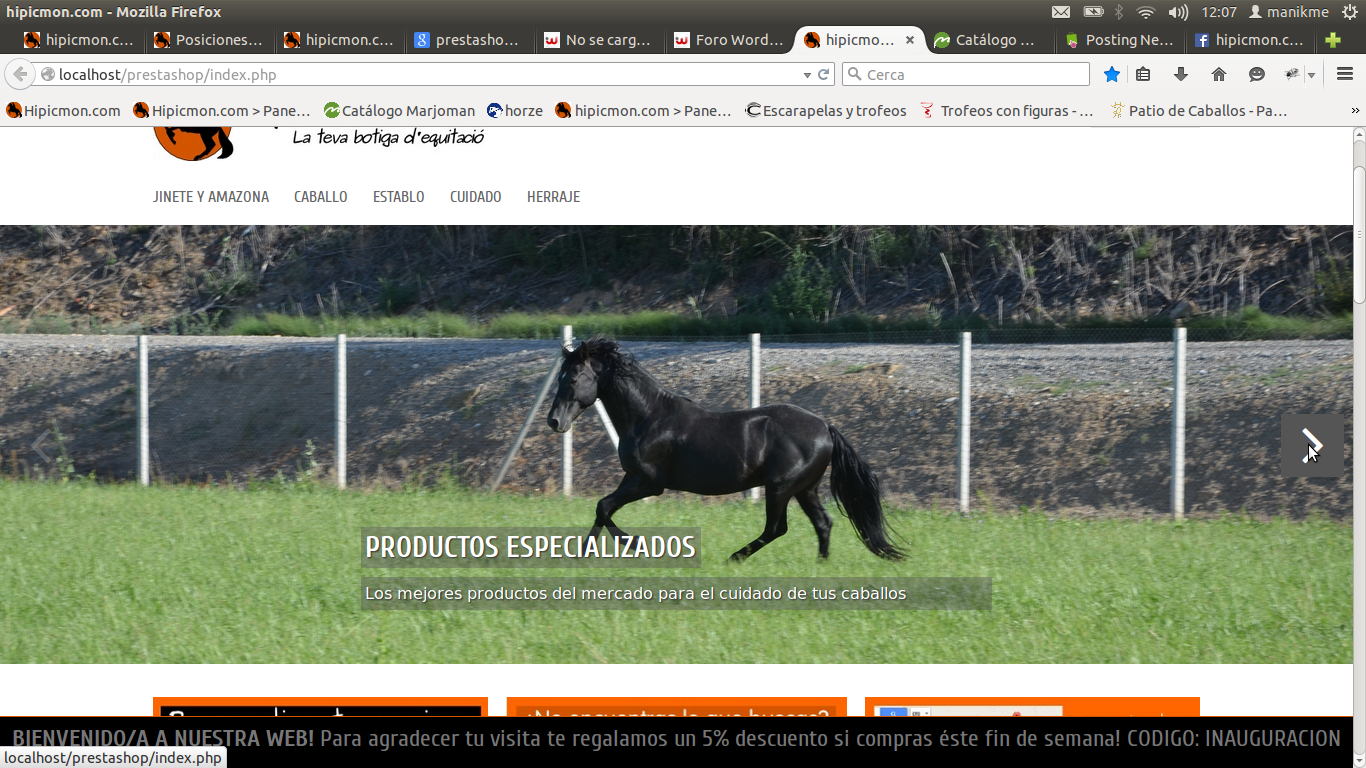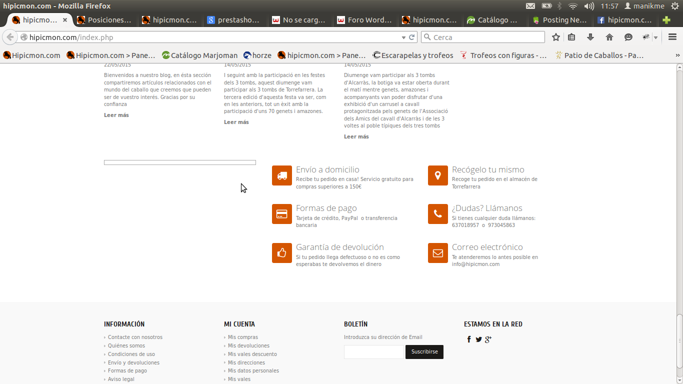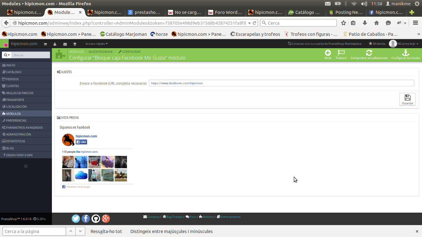 manikme Posted May 27, 2015 Share Posted May 27, 2015 Buenos días, Tengo un par de problemas en la web www.hipicmon.com El caso es que me estaba funcioanado todo correctamente y ahora tengo un problema con el módulo "Bloque caja Facebook Me Gusta". En principio parece todo correctamente configurado, pero no se carga en la página de inicio. Adjunto imagenes He revisado en posiciones de módulos y aparece tanto en el displayHeader y en el display Home. El segundo es en el módulo "Diapositivas de imagenes para tu web", se han desproporcionado las imagenes y no sé como corregirlo. Adjunto imagen de como aparecía hasta ahora y como se muestra ahora. No sé que es el que he tocado para que se modificaran éstos módulos. Sabéis cual puede ser el error? Muchas gracias Link to comment Share on other sites More sharing options...