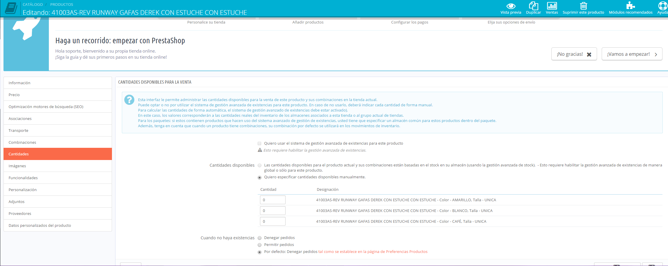 eleon Posted May 30, 2015 Share Posted May 30, 2015 Son dos cosas distintas: 1. Cantidades -> del producto 2. Cantidades -> de una combinación El problema está en que has puesto una cantidad para el producto, pero no para sus combinaciones, cuando intentas comprar una combinación te dice que no se puede porque el stock es 0 (lo cual es correcto). En la segunda imagen que has pegado verás que tienes un "0" y al lado el nombre de la combinación, basta con que le pongas la cantidad ahí. Nota: La cantidad del producto, no es la suma de las cantidades de las combinaciones, eso que has escrito no es correcto ya que son dos cosas indpendientes. Un cordial saludo. Link to comment Share on other sites More sharing options...