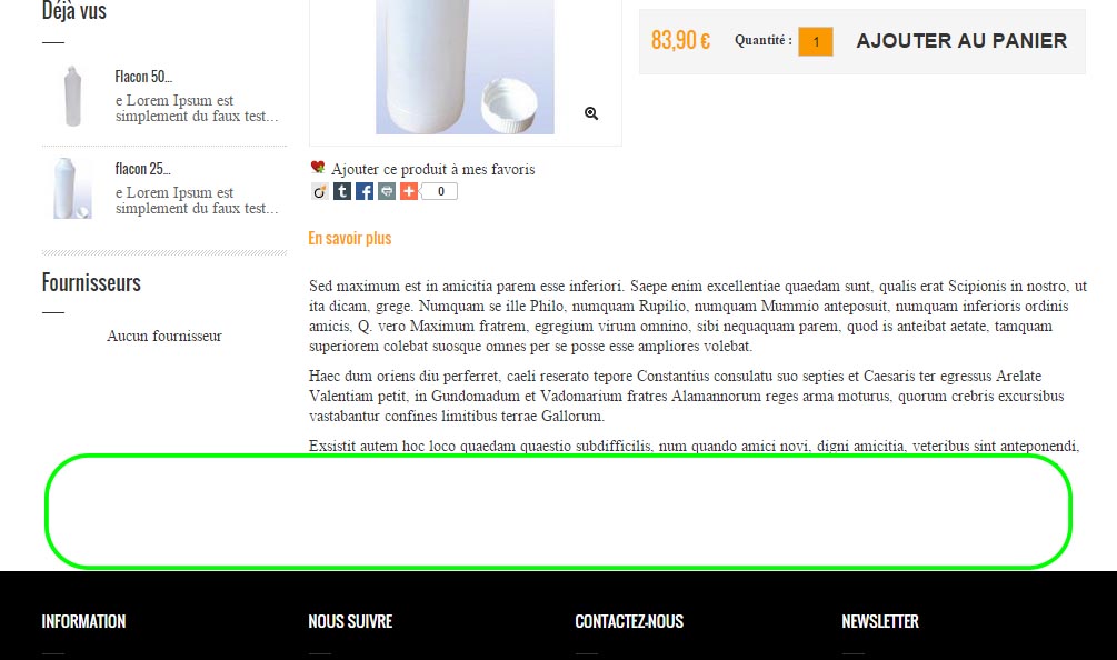 Jean André Posted May 30, 2015 Share Posted May 30, 2015 (edited) Bonjour j'aimerais pouvoir ajouter un bloc me permettant d'y mettre une image ou un texte entre le bas de la fiche produit et au dessus du footer. Je souhaite que ce bloc apparaisse sur le bas de toutes les fiches produits. la zone verte indiquée. Si vous avez la réponse ou un lien me filant la démarche je vous en remercie d'avance j'utilise un prestashop 1.5.6.2 Edited May 30, 2015 by Jean André (see edit history) Link to comment Share on other sites More sharing options...
