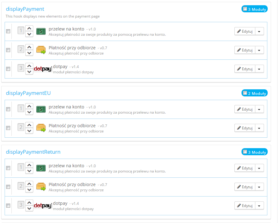 Od wczoraj staram się uruchomić płatności dotpay na swoim PrestaShopie (1.6.0.13), ale przy składaniu zamówienia (w sekcji płatności) w ogóle nie pojawia się taka opcja. Ponadto moduł dotpay nie pojawia się nawet w sekcji "Płatność" w BackOffice. Wydaje mi się, że jest nieaktywny, ale nie mam pojęcia, jak go włączyć (instrukcja twierdzi, że wystarczy podać ID i PIN). Podsyłam kilka screenów z panelu dla rozjaśnienia sytuacji.