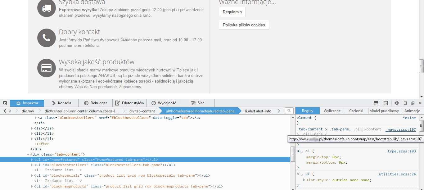 design4VIP Posted June 2, 2015 Share Posted June 2, 2015 (edited) ach to lenistwo nie chcialo mi sie wczesniej zagladac w zrodlo a tu sprawa jasna. plik ./themes/default-bootstrap/sass/bootstrap_lib/_navs.scss linia 197 .tab-content > .tab-pane, .pill-content > .pill-pane { display: none; } wywal display..... nie zagladalem, bo zazwyczaj zakladam, ze szukajcy w pierwszej kolejnosci zaglada w rodlo i takie "drobnostki" wyszukuje sam od tego jest firebug czy narzedzia chrome Edited June 2, 2015 by design4VIP (see edit history) Link to comment Share on other sites More sharing options...