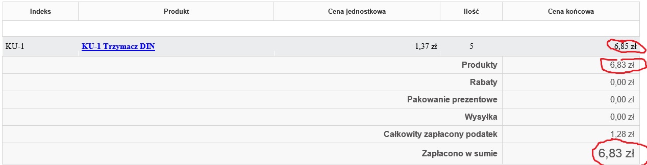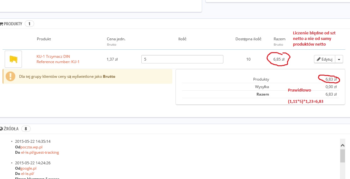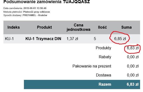 Ale od początku; ustawiłem w zakładce "Preferencje/Ogólne/Round type/ na Round on the total" czyli liczenie podatku VAT od sumy ilości produktu, przykładowo (1,11netto*5)*1,23=6,83 brutto tak jak powinno się to odbywać w Polsce. I wszystko by było ok, i działa na sklepie prawidłowo w module Koszyka, w Historia zamówienia u klienta, natomiast w zamówieniu w backoffice, mailu do klienta i do obsługi wyświetla błędnie tak jakby nie realizował zmiany czyli (11,1netto*1,23)*5=6,85brutto.