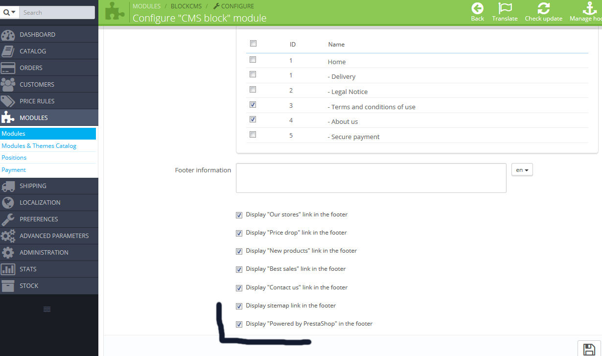 selectshop.at Posted June 5, 2015 Share Posted June 5, 2015 You don't need to modify nothing. Simply uncheck the check on CMS block module. See screen attached. Taba modules > modules > cms block and uncheck "copyright" Link to comment Share on other sites More sharing options...