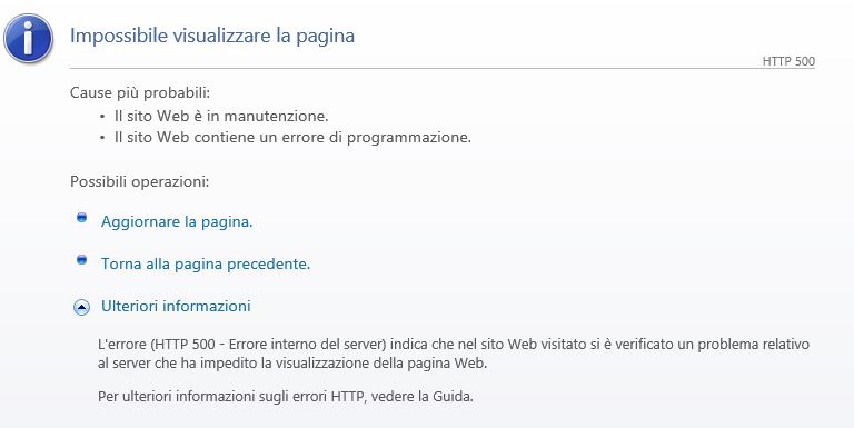 Moreno81 Posted June 10, 2015 Author Share Posted June 10, 2015 Non sapendo cosa fare nè dove poter mettere le mani, ho provato a fare la stessa cosa cambiando Browser. Passando da Chrome a Internet Explorer, il risultato è che mi dà, allo stesso punto della procedura di pagamento in cui Chrome si fermava e dava pagina bianca, un errore "HTTP 500". Di cui allego l'immagine. Non so che fare nè dove poter intervenire. Cosa posso fare? Grazie! Link to comment Share on other sites More sharing options...
