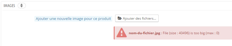 Eprz Posted June 11, 2015 Share Posted June 11, 2015 (edited) Bonjour à toutes & à tous, Je travail actuellement en local (WAMP) sur le développement d'un thème Presta. En ajoutant des produits autres que ceux de la démo pour des tests, je me suis aperçu que j'avais une erreur lors de l'upload d'images (voir screen ci-joint). J'ai donc le message suivant : nom-du-fichier.jpg : File (size : 40496) is too big (max : 0) Ce qui me gêne, c'est le max : 0. J'ai donc fais une recherche dans les configs, et RAS, mes MaxSize sont renseignés et supérieurs à 0, idem dans le php.ini. Aucune piste à l'heure actuelle malgré mes recherches fichiers & google Est-ce que ça vient de la gestion Wamp ? De Presta ? No idea .. En vous remerciant pour votre temps. Cordialement, Elia PEREZ. Edited July 14, 2015 by Eprz (see edit history) Link to comment Share on other sites More sharing options...