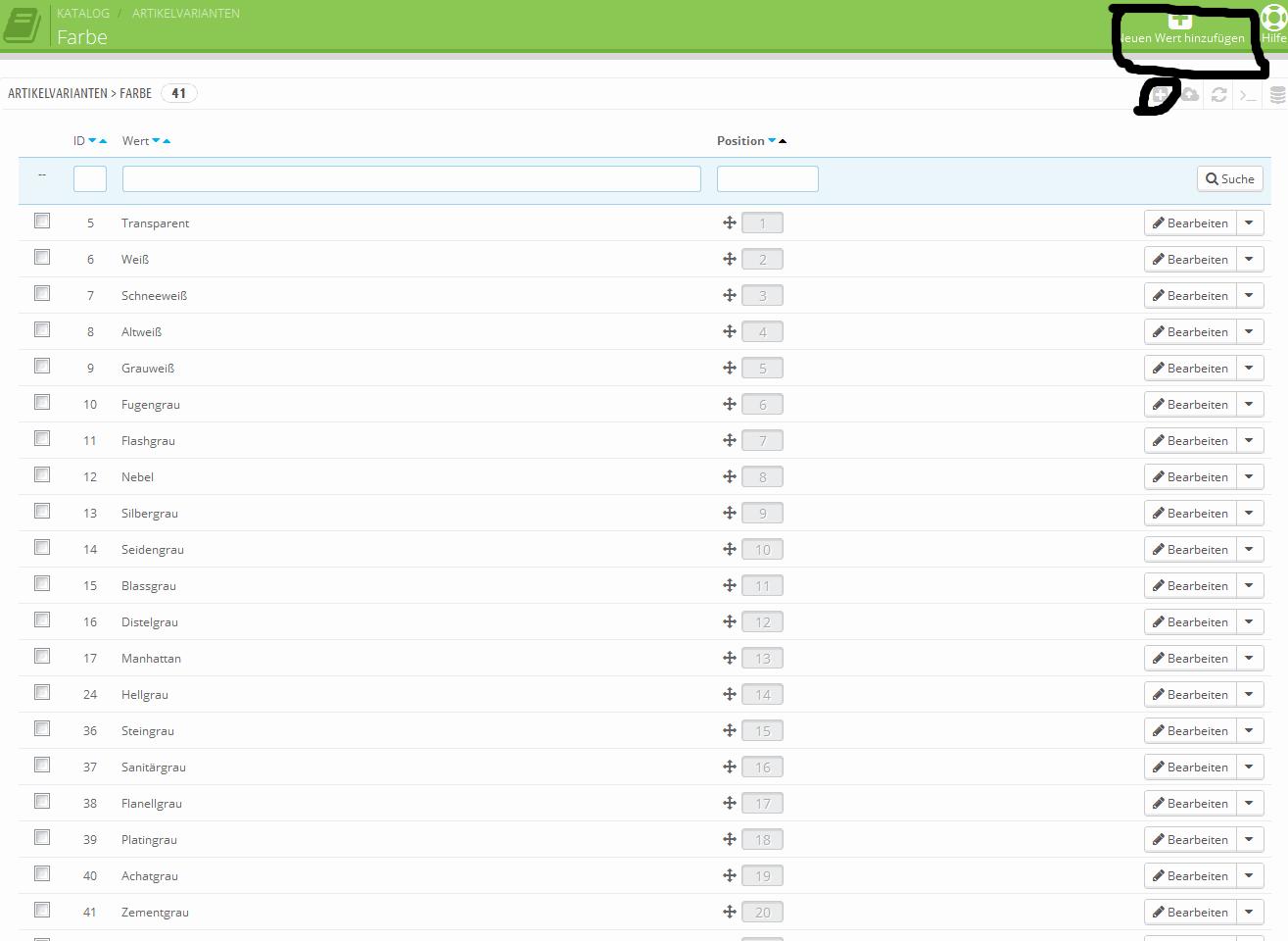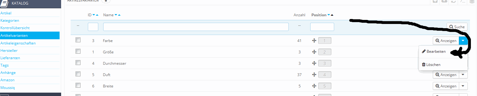 ich komme mir gerade etwas dämlich vor, ich habe nämlich dasselbe Problem... ;-) bei artikelvarianten > + (neue variante anlegen) kriege ich wiederum nur die drei Vorschläge "size", "color", und "Shoe size". Wo kann ich denn eigene Attribute erstellen? Am Wichtigsten ist mir, dass ich die Farben auf Deutsch umbenennen und noch mindestens zwei Grössenabstufungen einfügen kann...