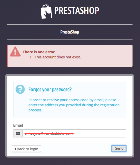 Whenever attempting the "Lost Password" option on Prestashop I get the "1. This account does not exist" error.