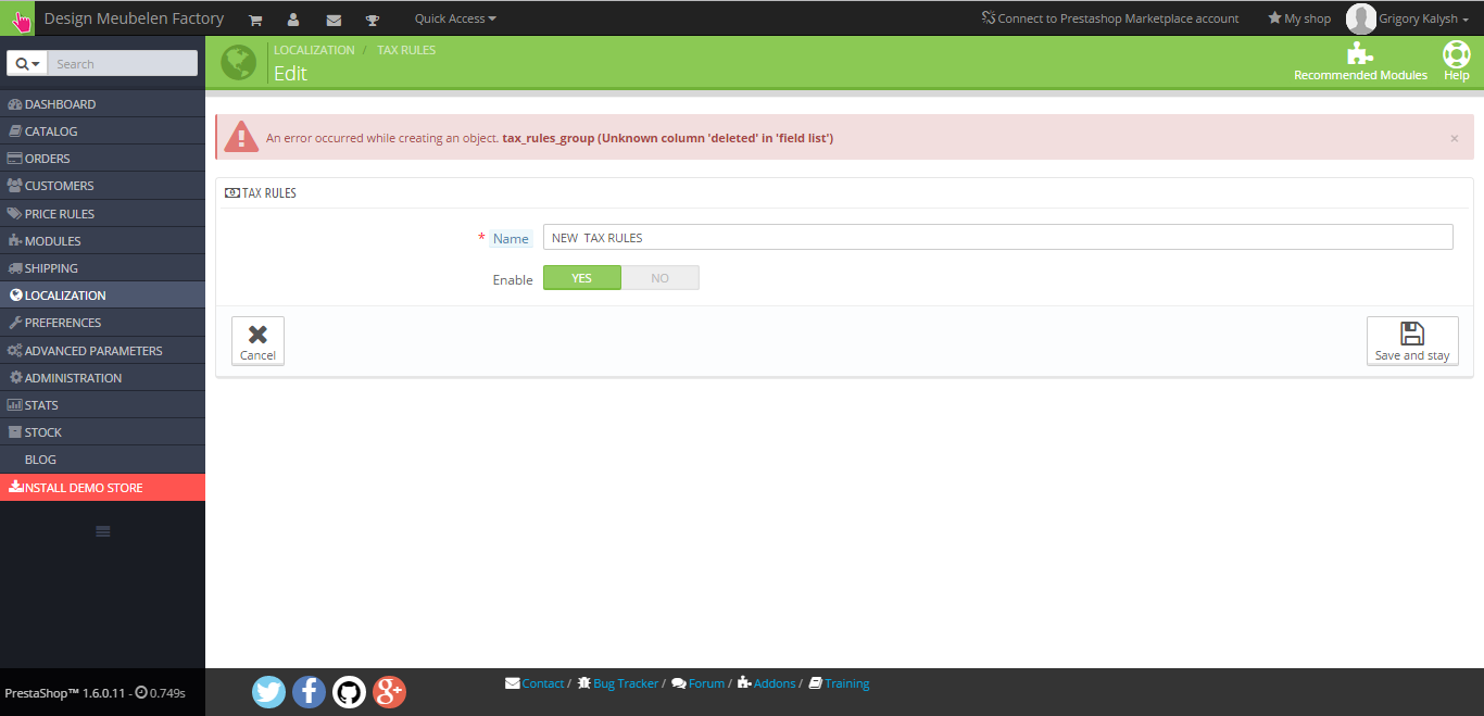 Grigoriy Posted June 17, 2015 Share Posted June 17, 2015 Hello. I have a problem when I turn on the tax rules, it gives an error. Bad SQL query Unknown column 'a.deleted' in 'where clause. And if I want to add new tax rules group, gives, an error occurred while creating an object. tax_rules_group (Unknown column 'deleted' in 'field list') How can I fix this? Help me please. Link to comment Share on other sites More sharing options...