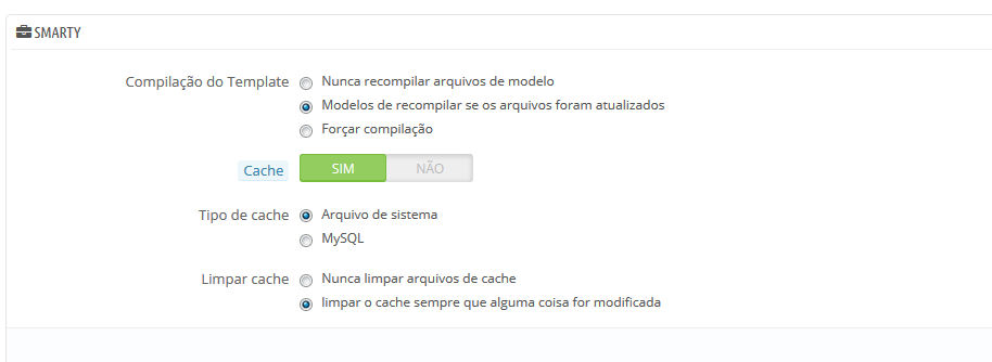 Vc. jamais deverá desativar o cache smarty (vc. somente desativa quando está fazendo alteracoes em ficheiros, o resto do tempo deverá ficar ativado para nao criar um monte de ficheiros temporários que nunca serao deletados do seu servidor).  Veja a configuracao correta no screen qua anexei, e por favor nao mude opcoes de cache sem saber o efeito que pode ter. Cache sempre deverá estar ativado.