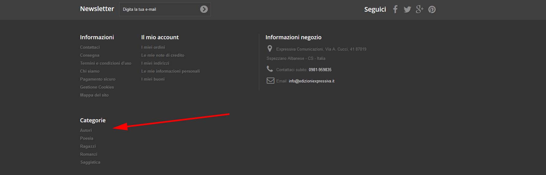 expressiva Posted June 23, 2015 Share Posted June 23, 2015 (edited) Ciao a tutti, da oggi ho un problema con il blocco categorie nel footer. questo, che prima era allineato agli altri in un'unica riga, oggi mi si è spostato nella seconda riga. Credo che sia accaduto dopo che ho reimpostato il modulo. Ora quello che vedo è quanto potete osservare nell'immagine... Come posso risolvere? Grazie a tutti per le risposte! ps: uso la versione 1.6.0.13 Edited June 23, 2015 by expressiva (see edit history) Link to comment Share on other sites More sharing options...