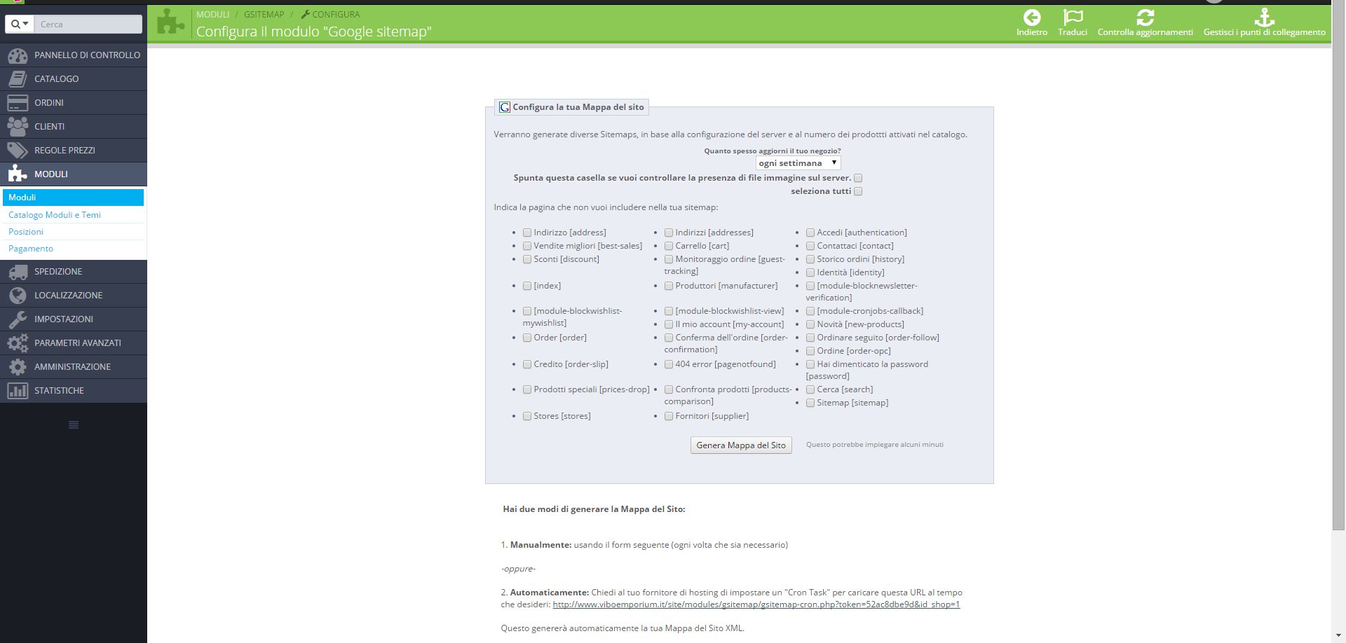 pakito07 Posted June 26, 2015 Share Posted June 26, 2015 Buongiorno a tutti sono nuovo del posto ed e la prima volta che uso prestashop....ho installato il modulo Google sitemap ma quando vado a generare la sitemap non mi trova le categorie ed i prodotti come mai? c'è qualche passaggio da fare che io non so? qualcuno di voi e cosi gentile da aiutarmi? Link to comment Share on other sites More sharing options...