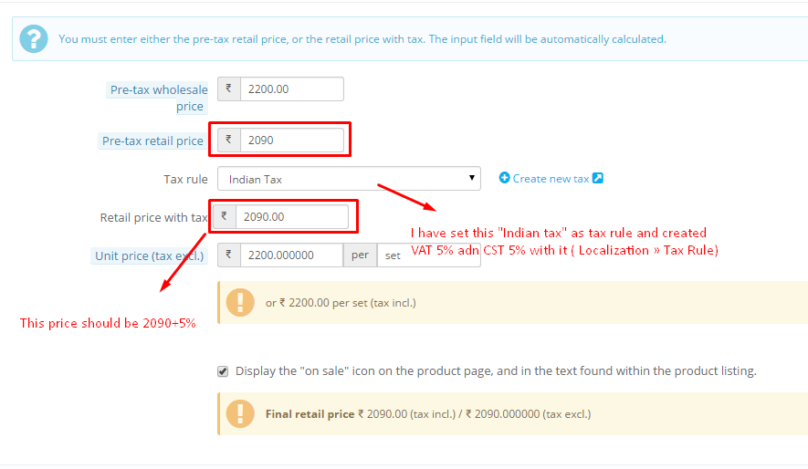 xlinkinfocom Posted June 29, 2015 Share Posted June 29, 2015 I created a tax rule called “Output Tax” I then added CST tax (all states in India other than West Benal) at 5% to this rule. I also added VAT (Only for west bengal state) at 5% to this rule. All products have “Output” set as the tax Rule on the prices tag. Dependent on customers’ location either 20%, 5% or no tax is charged. But the problem is that, when I selected tax rule as "Output-tax", the "Pre tax retail price" and "Retail price with tax" remain same. Like, if my pretax retail price is Rs. 100/- and I choose Output tax as tax rule then my retail price with tax should be 105/-. But it remains same. Any help will be appreciated. Thanks in advance. Link to comment Share on other sites More sharing options...