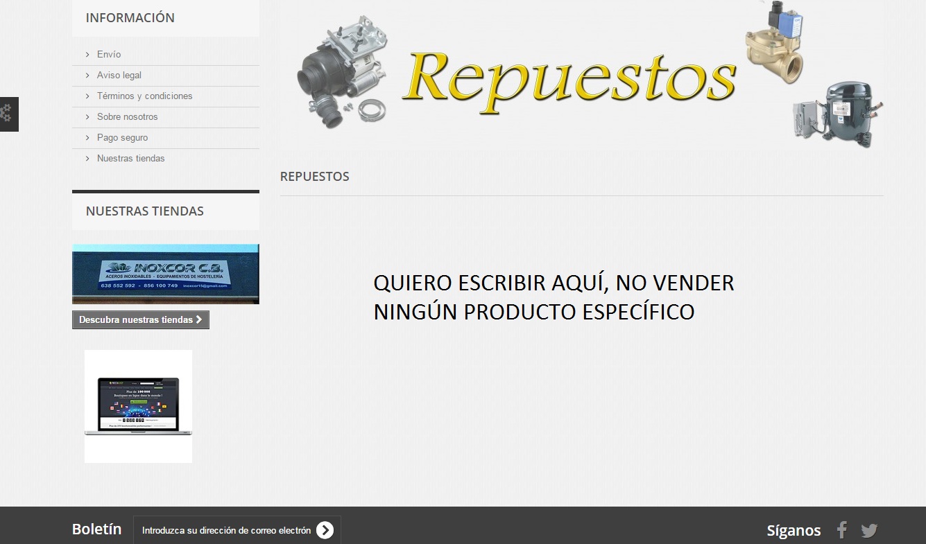 joseangelcadiz Posted June 30, 2015 Share Posted June 30, 2015 Buenas tardes, necesito escribir en una categoría, en el lugar donde van los productos., si escribo en descripción, el escrito tan solo se haría en el encabezado, quedando horroroso y pisando la imagen creada de REPUESTO en amarillo. Necesito escribir tal y como os he mostrado en el montaje de abajo, ya que dicho apartado es muy amplio y existen mas de 10.000 piezas de repuestos en catálogos, por lo que me gustaría indicar que para el pedido de cualquier repuesto, nos manden la referencia y el modelo, y redirigirlos a contactar, en donde he creado una opción de contacto que pone repuestos. ¿Sabéis como puedo hacerlo? Link to comment Share on other sites More sharing options...