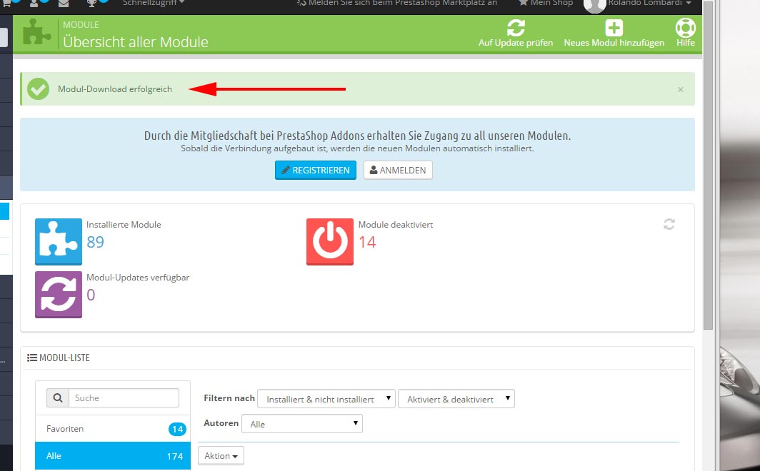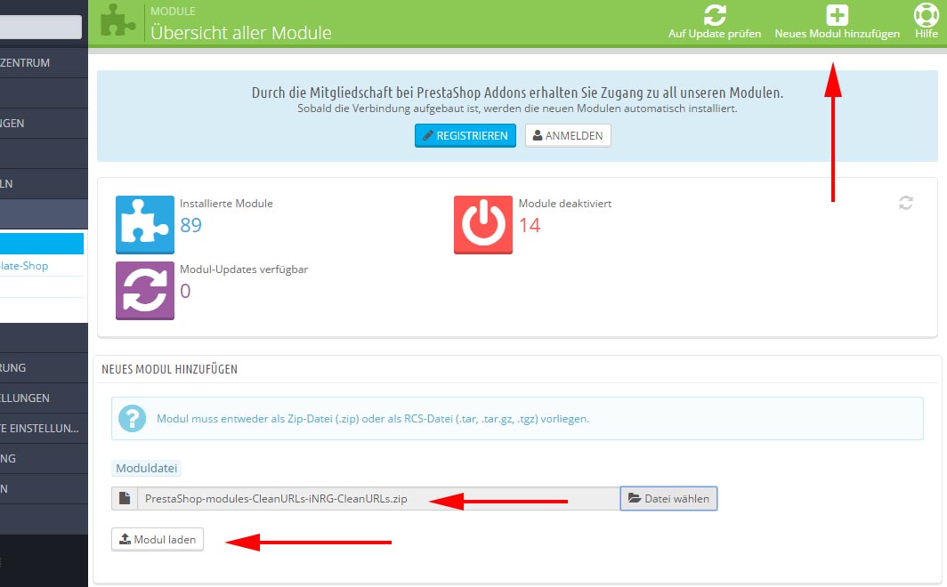 Birel34 Posted July 3, 2015 Author Share Posted July 3, 2015 Hallo Whiley Besten Dank für die schnelle Antwort. Habe die Datei mit Deinem Link heruntergeladen, siehe Bild: Habe folgende Datei erhalten: PrestaShop-modules-CleanURLs-iNRG-CleanURLs.zip Nun bin ich im PrestaShop (Version 1.0.6.14) auf Module gegangen und habe über "Neues Modul hinzufügen" über "Datei wählen" den Link gesucht und angecklick, danch habe den Button "Modul laden" geklickt. Dan bekomme ich folgende Meldung: Nun kann ich aber das Modul nicht finden! Wo ist es abgelegt? Freue mich auf eine positive Antwort. Freundliche Grüsse Rolando Link to comment Share on other sites More sharing options...