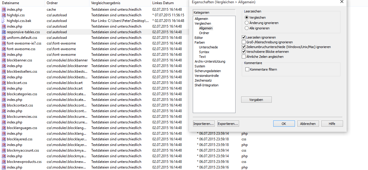 Gohan Posted July 7, 2015 Author Share Posted July 7, 2015 (edited) naja eine sicherung vom theme habe ich ja. Werde das mit winmerge mal versuchen LG nachtrag: Es ist zwar offtopic, aber wie genau funktioniert winmerge? Ich habe mein theme und das default als vergleich geladen und es wird angezeigt, das alle dateien unterschiedlich sind, aber wenn ich z.B. \default-bootstrap\cache\index.php öffne ist da kein unterschied zu finden. alles gleich, aber alles rot angezeigt. Wenn ich dann in den Einstellungen sage das Zeilenumbrüche etc nicht als unterschied gezeigt werden sollen, steht in der übersiecht immer noch "Dateien sind unterschiedlich" aber wenn ich sie öffne sagt er, das kein unterschied zu finden ist. Irgendwie ist das gerade ziemlich verwirrend für jemanden, der damit noch nie gearbeitet hat :/ LG Edited July 7, 2015 by Gohan (see edit history) Link to comment Share on other sites More sharing options...