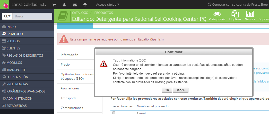 veriko12 Posted July 8, 2015 Share Posted July 8, 2015 Hola amigos, Tengo un problemilla con mi tienda... seguramente será de fácil solución, pero al ser la primera vez que introduzco artículos para la venta quizá se me esté escapando algo. La cuestión es que al introducir los datos de los productos (no en todos, pero a veces) me aparece la pantalla de la imagen adjunta. No sé a qué se debe, pone que hace falta que esté relleno el campo "name" y no sé a cual se refiere. Y también que ha habido un error del servidor. Yo trabajo en local con Xampp. Tampoco tengo idea de qué puede estar fallando. ¿Le ha pasado a alguien? ¿podríais echarme una mano? Un saludo. Qué bueno es este foro, siempre me ayuda un montón gracias de antemano! Link to comment Share on other sites More sharing options...