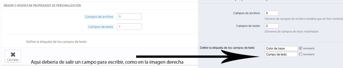 disso Posted July 8, 2015 Share Posted July 8, 2015 Hola! Tengo un pequeño problema, y no se si es un bug o algún tipo de problema que pueda tener en la instalación... Quiero poner un campo en algunos productos, para que el cliente pueda poner un nombre personalizado al producto, he visto que se hace desde la Pestaña (Personalización del propio producto), pero al poner 1 campo y darla a guardar y permanecer, supuestamente me debe de aparecer un campo para ponerle un nombre y decirle si quiero o no que sea obligatorio. El problema viene, en que no me sale ningún campo, es decir, sale vacio y no me deja escribir en ningún sitio. Adjunto imagen para que se vea lo que me sale a ver si alguien me puede ayudar Gracias! Un saludo Link to comment Share on other sites More sharing options...