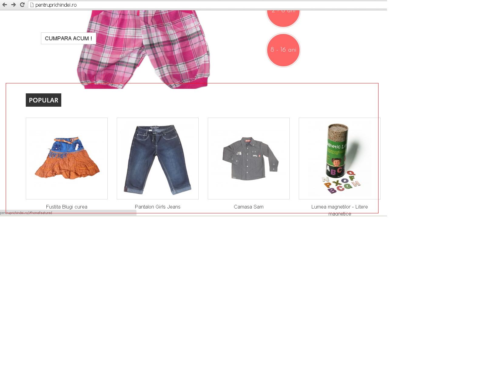 standdowncafe Posted July 29, 2015 Author Share Posted July 29, 2015 Yes Nemo, they are in the right category. Problem is not that they are not visible in category, but the category is not present, by default, on first page Visit my link http://pentruprichindei.ro/ You will find, under central banner, the tab "Popular" - click and you will see 12 random products. My wish is that this category to be by default present and visible when someone visit my shop. This would not be a problem if i would have a constant input for new products, that category will be visible. Link to comment Share on other sites More sharing options...