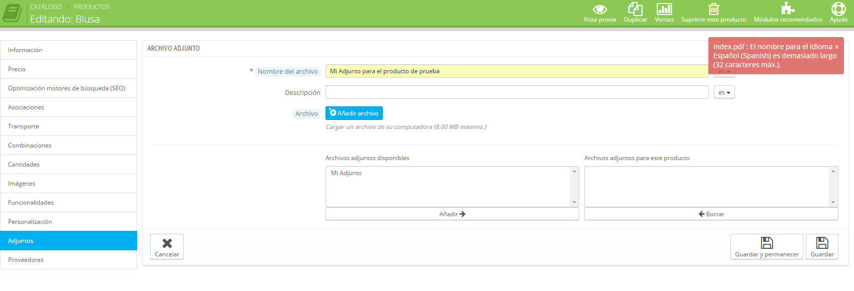ventura Posted August 5, 2015 Share Posted August 5, 2015 Tienes que editarlo tambien en controllers\admin\AdminProductsController.php en esta parte if (!Validate::isGenericName($name)) $_FILES['attachment_file']['error'][] = sprintf(Tools::displayError('Invalid name for %s language'), $language['name']); elseif (Tools::strlen($name) > 32) $_FILES['attachment_file']['error'][] = sprintf(Tools::displayError('The name for %1s language is too long (%2d chars max).'), $language['name'], 32); } con el valor que hayas puesto en en array del classes\Attachment.php Link to comment Share on other sites More sharing options...