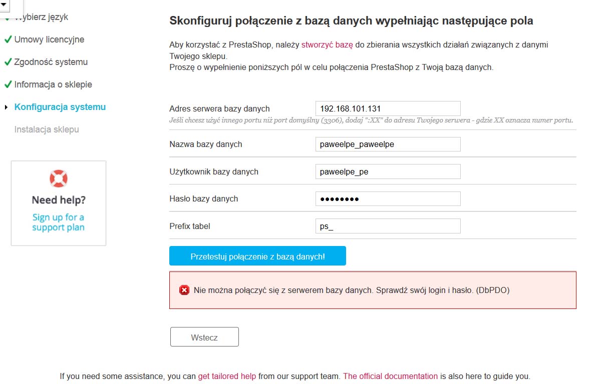 Sprawdziłem n razy, czy nazwa bazy danych, użtkownik i hasło są poprawnie wpisane i wciąż nie mogę przejść dalej w instalacji.
