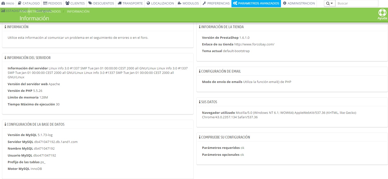 Rosa FORCOBAY Posted July 21, 2015 Share Posted July 21, 2015 Buenos días a todos compañeros. Esta madrugada, tras realizar las preceptivas copias de seguridad de la base de datos y de los ficheros, así como comprobar que todos los módulos estaban actualizados y desactivar los no nativos, nos decidimos a actualizar nuestra web mas "vieja" www.forcobay.com. Teníamos la versión 1.6.0.5 y hemos actualizado a la versión 1.6.1.0. Mas abajo os dejo los datos del servidor y algún pantallazo mas. El caso es que mediante el módulo de actualización 1 Click Upgrade, la actualización fue como la seda y al parecer no hubo ningún problema. En el front todo es correcto, se generan pedidos y todo parece funcionar correctamente, pero....en el backoffice es donde vienen los errores múltiples, que paso a detallaros por si con vuestra AYUDA podemos solucionar nuestros problemas y de paso ayudar a aquellos que les pase algo similar: - Parte de los botones están parcialmente descolocados de la que debería ser su posición y al pasar el ratón sobre ellos, no se abren los submenús, dándote solo la opción de hacer click sobre el menú principal, catálogo, pedidos, clientes....etc. Para acceder a los submenús nos ha tocado hacerlo mediante el buscador del backoffice, que funciona perfectamente. Hemos provado a cambiar la configuración de los menús para mostrarlo en vertical y en este caso, tampoco hace el despliegue de los submenús y la pestaña para cerrar el cuadro - En Productos, el editor Tinymce ha desaparecido, al igual que en otras secciones del backoffice como en las páginas CMS. En la descripciones, se muestra el cuadro con el contenido html y nada mas. El contenido de las descripciones está completo y funcional desde el front office de la tienda. - También en Productos, no se puede abrir ninguna de las pestañas para configurar el producto, precio, optimización, asociaciones....etc. Al pulsar sobre las pestañas se vuelve a cargar la pantalla inicial de información del producto. - En el apartado de módulos, el buscador no funciona y no muestra los módulos a medida que se va introduciendo el texto. - En Temas, no aparecen las pestañas para su selección no aparece sobre las imágenes de los temas que tenemos cargados. - Los mensajes de ayuda de backoffice no se abren al pasar el ratón sobre ellos, a pesar de estar habilitados. - Cuando se abre una pestaña desplegable, no se puede seleccionar ninguna de las opciones. De momento, estos son los errores que hemos detectado, aunque suponemos que tendremos algunos mas. Qué hemos hecho de momento para intentar solucionarlos? - Primero nos dimos cuenta de que los permisos de algunas carpetas y archivos, habían pasado a 705 o 644. Cambiamos los permiso a 755 y 644 respectivamente. - Activamos manualmente el Debug de errores. No aparece error alguno ??????? - Limpiamos las caché tanto de la tienda, como del navegador. Ningún cambio. - Intentamos conectarnos de diferentes navegadores y equipos. Todo va igual de mal. Se os ocurre alguna solución? Muchas gracias a todos por vuestras aportaciones! Saludos Juan Carlos Link to comment Share on other sites More sharing options...