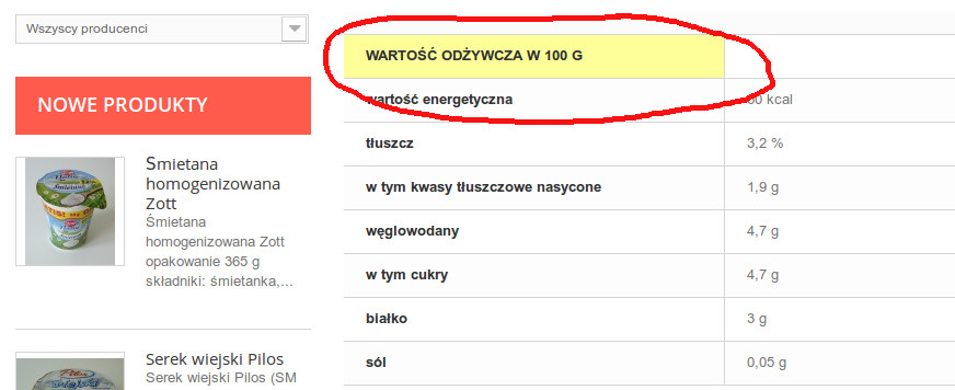 Edytując stronę produktu za pomocą Firebug dodałem kolor tła dla wybranej cechy (WARTOŚĆ ODŻYWCZA W 100 G - bgcolor #FFFF99 )