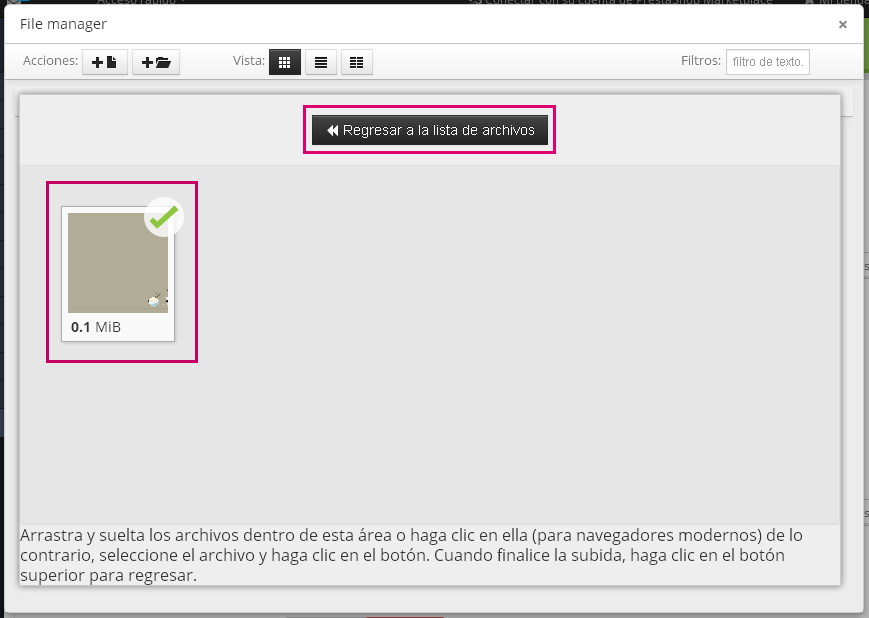 Pero cuando regreso a la lista de archivos, mi nueva imagen no está visible. Tampoco figura la imagen rota, con lo cual descarto que sea un problema de url's...