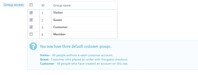 BTutt Posted July 24, 2015 Author Share Posted July 24, 2015 A SQL query like this should do the work: INSERT IGNORE INTO ps_category_group (id_category, id_group) SELECT id_category, 6 FROM ps_category; 6 is the id of your custom group. Awesome gabdara! Thank you for the reply. That appears it will do what I need - Add the custom "Members" group to the groups on each category that currently exists. However, I was hoping there was a way to add a new custom group to the default groups so that I do not have to keep checking the check box for every entry added to the shopping cart. The query would work, but I still have many categories to add and then hundreds of products. Clicking a check box on each item is kind of silly. I wish I knew how the default groups were set so that I could just add the new group to the defaults. I believe that solution would automatically check the box and all categories and products would be available to the new group. At least that is what I would expect to happen if I could add it to the default groups. Otherwise, I will have to do a SQL insert every time I add products and/or categories. By the way, I am not knocking your solution at all and I greatly appreciate your help. I import CSV files (products and categories) and I don't see a column for groups. Any other ideas? Link to comment Share on other sites More sharing options...
