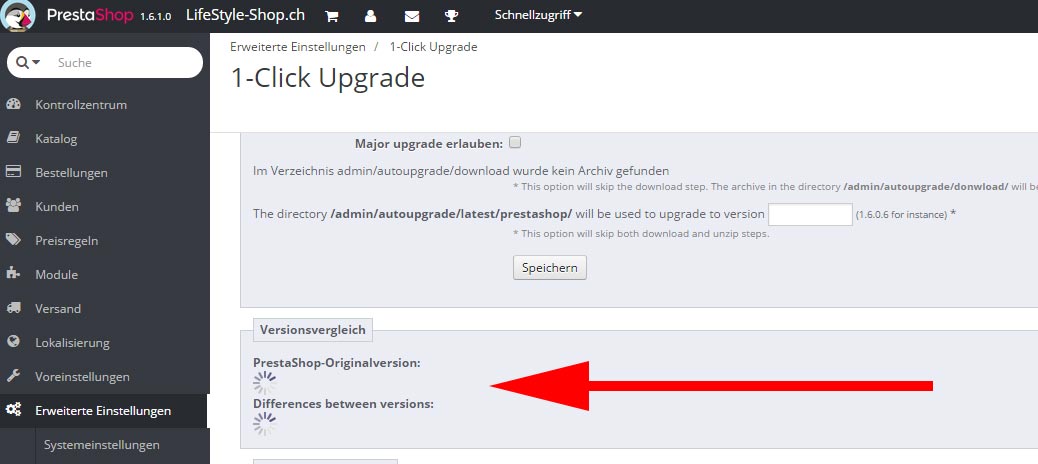 Habe mal den "Versionenvergleich" unter "1-Click Upgrade" angeklickt und nun hört es nicht merh auf zu drehen.