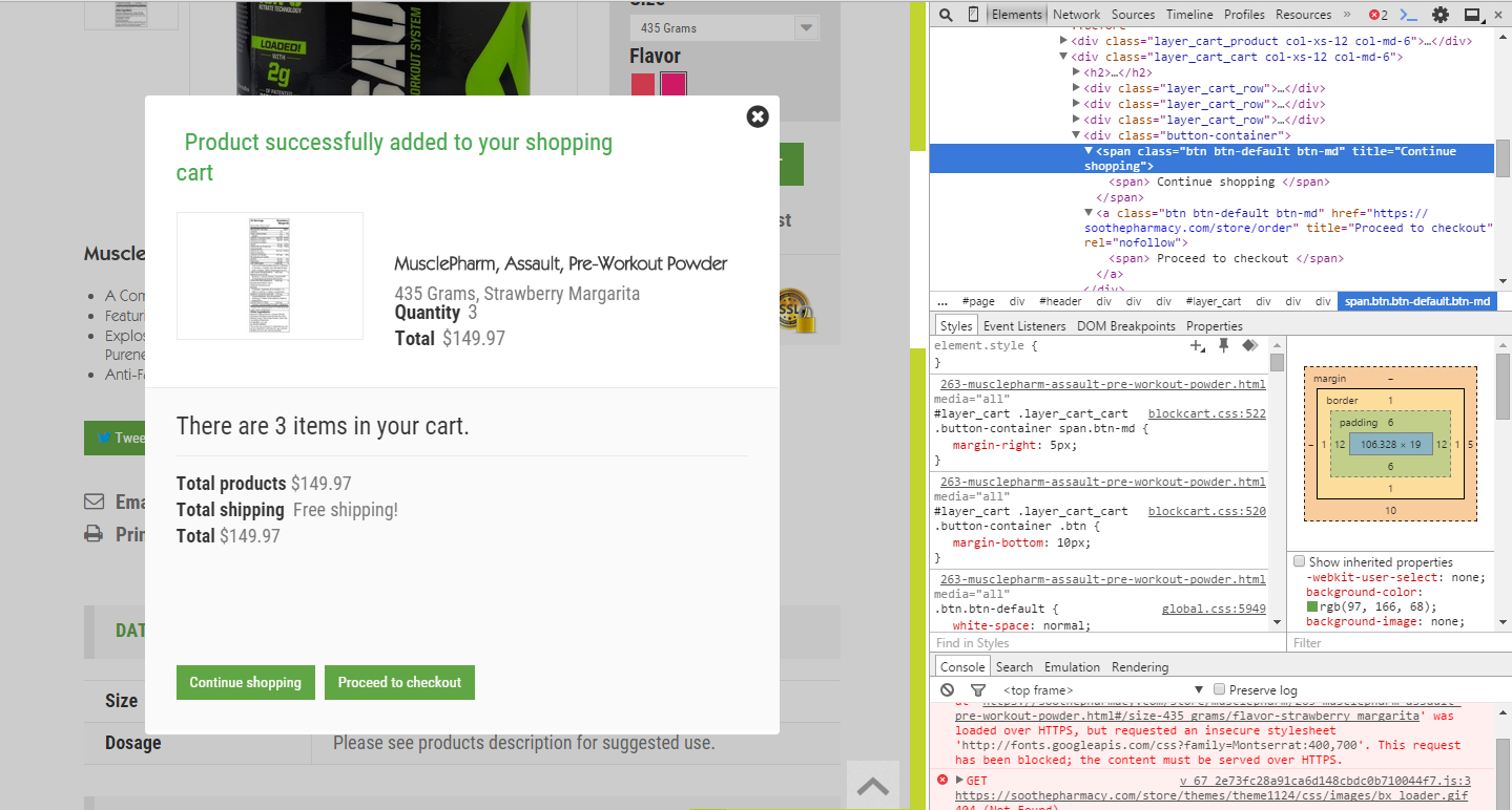 clint Posted August 3, 2015 Share Posted August 3, 2015 (edited) Hi, I've found the problem. You have icon-left and icon-right on the button if you remove the icon-left & icon-right the display is correct (see screen shot) If you want the icon-left and icon-right you have to have these separately I also noticed a class of "continue" on the first button, is this a typo? If you have any more trouble post your /theme/modules/blockcart/blockcart.tpl file and I'll make the required changes for you Also, have you fixed the other issues as I cannot see what the problems are? Clint **edit** You might also want to look at those errors you are getting as they are easy fixes. Missing image and a font being served http rather than https Edited August 3, 2015 by clint (see edit history) Link to comment Share on other sites More sharing options...