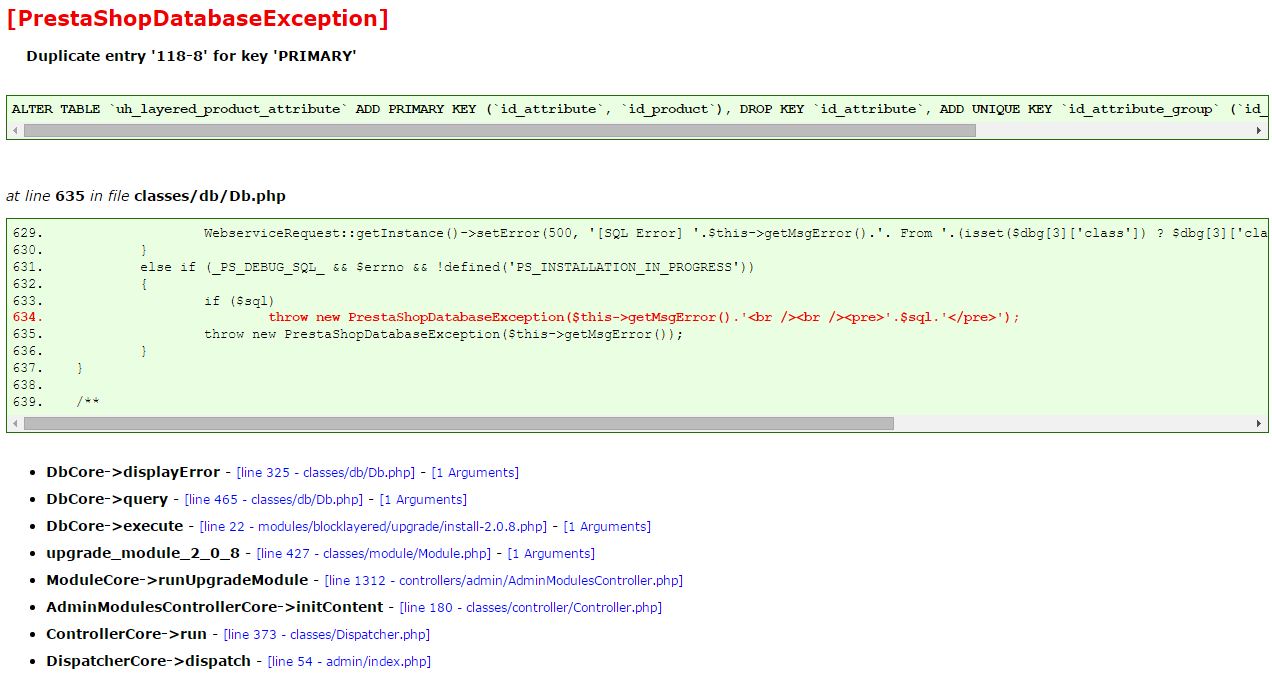 Eusebio100 Posted August 2, 2015 Share Posted August 2, 2015 Hola, Al actualizar el módulo Bloque de navegación por facetas me ha aparecido el error Duplicate entry '118-8' for key 'PRIMARY' y ahora no me deja entrar a la página de módulos, siempre me lleva al mismo error, adjunto captura. Alguien sabe una solución para esto? Gracias de antemano. Link to comment Share on other sites More sharing options...