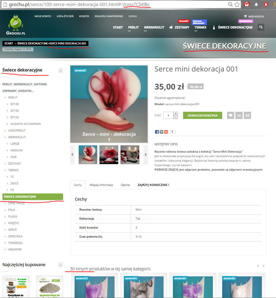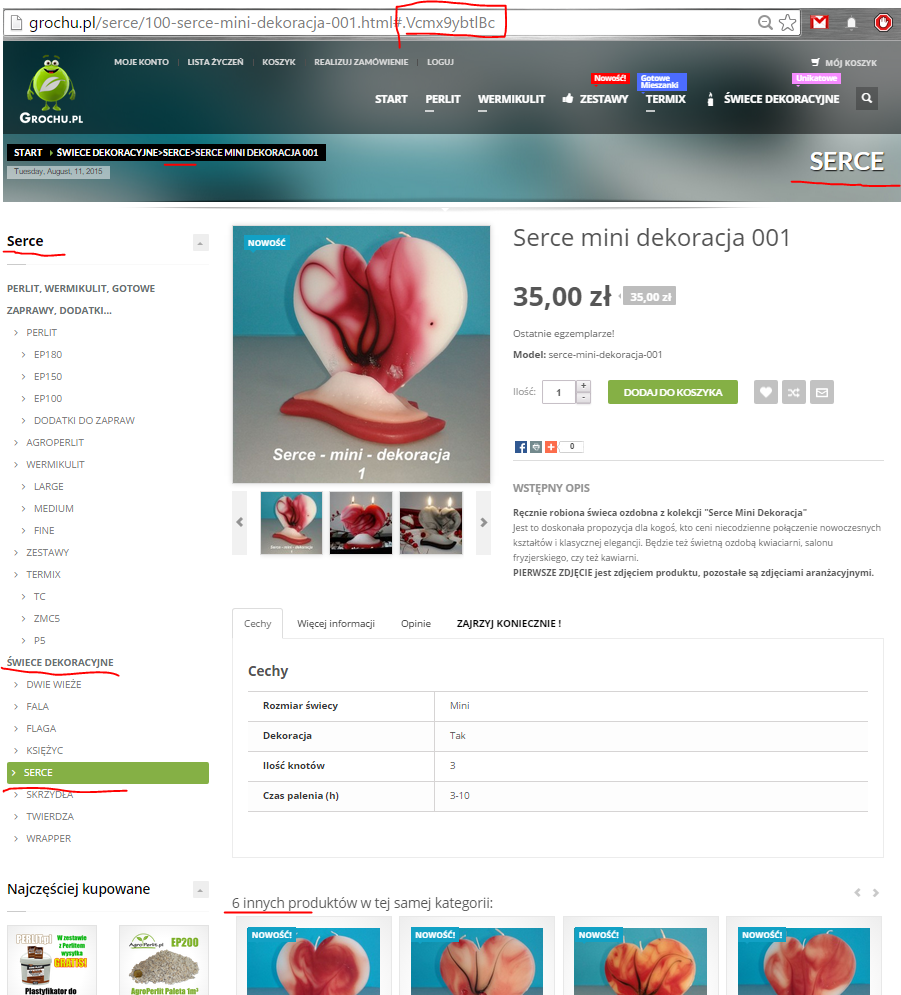 martsoni Posted August 13, 2015 Author Share Posted August 13, 2015 Nic to nie zmienia.Można to zobaczyć live na www.grochu.plPrzykład który podałem dotyczy świeć dekoracyjnych I 1. klikamy w menu z lewej na świece dekoracyjne 2. następnie na produkt Serce mini dekoracja 001 - patrzymy jaki jest efekt II1. klikamy w menu z lewej na Serce (podkategoria świec dekoracyjnych)2. klikamy na produkt Serce mini dekoracja 001Efekty się różnią tak jak przedstawiłem na screenshotach.Cache czyszczony, wyłaczany, włączany... efekt ten sam. Link to comment Share on other sites More sharing options...