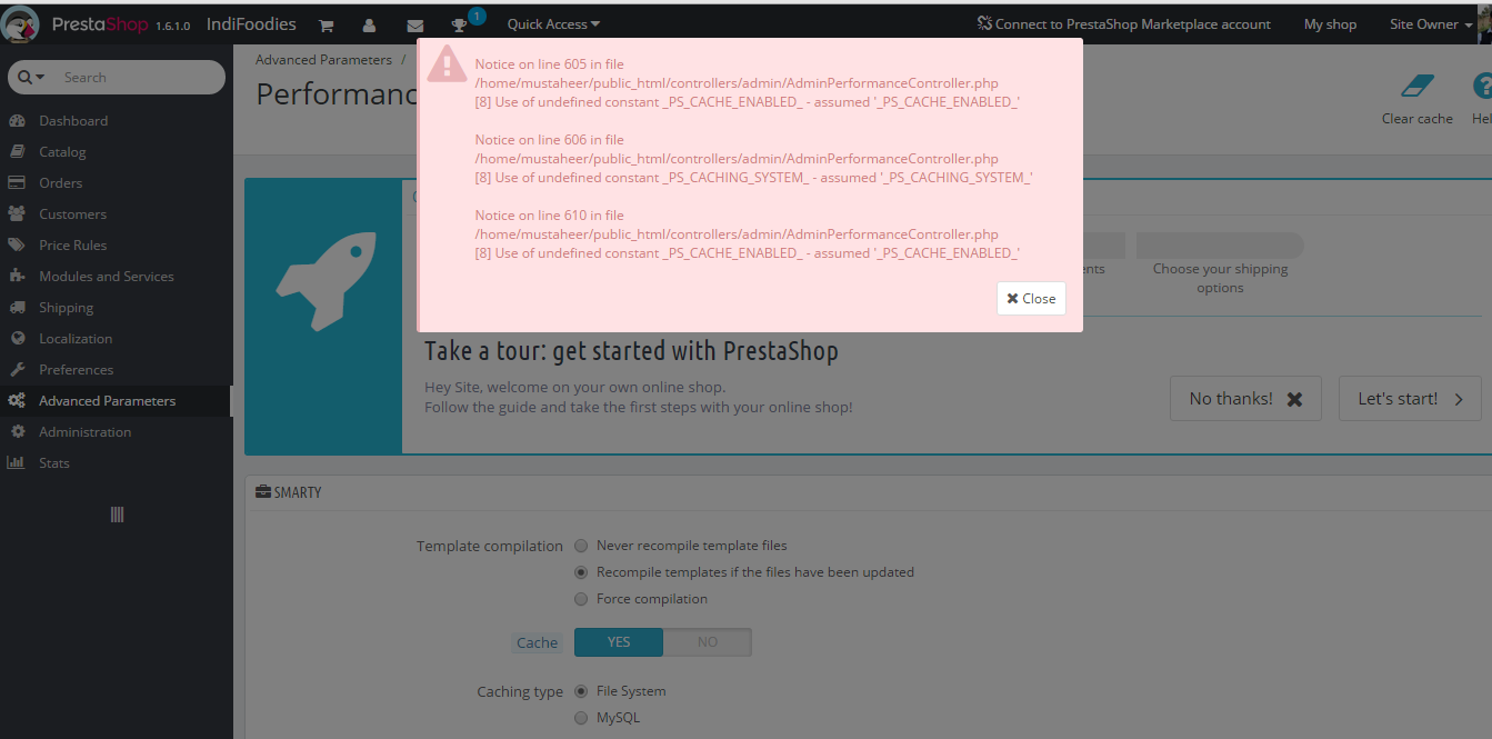 mustaheer Posted August 12, 2015 Share Posted August 12, 2015 Can somebody help me with below error. Whenever I click on Performance from Advanced Parameter it gives me below pop up error. Notice on line 605 in file /home/mustaheer/public_html/controllers/admin/AdminPerformanceController.php[8] Use of undefined constant _PS_CACHE_ENABLED_ - assumed '_PS_CACHE_ENABLED_'Notice on line 606 in file /home/mustaheer/public_html/controllers/admin/AdminPerformanceController.php[8] Use of undefined constant _PS_CACHING_SYSTEM_ - assumed '_PS_CACHING_SYSTEM_'Notice on line 610 in file /home/mustaheer/public_html/controllers/admin/AdminPerformanceController.php[8] Use of undefined constant _PS_CACHE_ENABLED_ - assumed '_PS_CACHE_ENABLED_' Here is the screenshot for the same. Link to comment Share on other sites More sharing options...