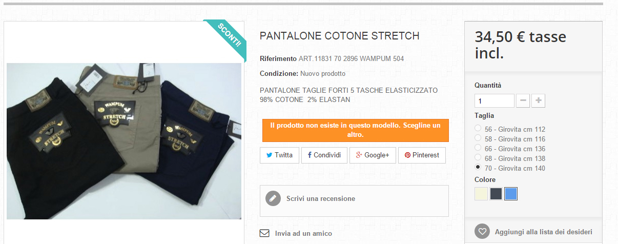 Allego immagine del blocco prodotto che ho adesso e come si vede nell'immagine mi da tutte le taglie e tutte le varianti di colore e se si seleziona un colore o una taglia che non è disponibile appare la dicitura " Il prodotto non esiste in questo modello. Scegline un altro. ".