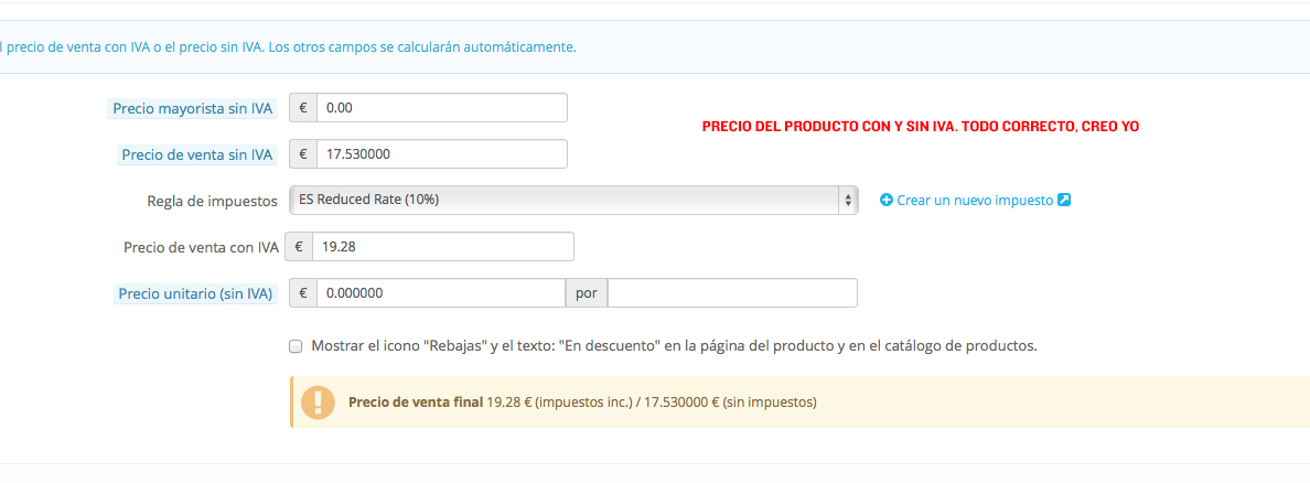 David López Posted August 16, 2015 Author Share Posted August 16, 2015 Hola.Encontré el error, que en realidad no era un error de la configuración que le había puesto ni del mecanismo del mismo. El error era de mi percepción, puesto al estar registrado para hacer las pruebas con una dirección correspondiente a la "Provincia de Murcia", daba igual la provincia que pusiera para ver que el cálculo lo hacía correctamente, cuando un paso después, yo le confirmaba el pedido (y se cambiaba automáticamente) para que me lo mandara a Murcia. Claro, normal y lógico. ¡Vaya cabeza!He hecho la prueba con otros registros, haciéndome pasar por ciudadano de otras provincias y haciendo lo mismo, todo sale igual, es decir, correcto o incorrecto (cuando pruebo una comunidad diferente a la mía y después pongo que la lleven a la mía).¡Muchas gracias y perdonen, de verdad! Link to comment Share on other sites More sharing options...